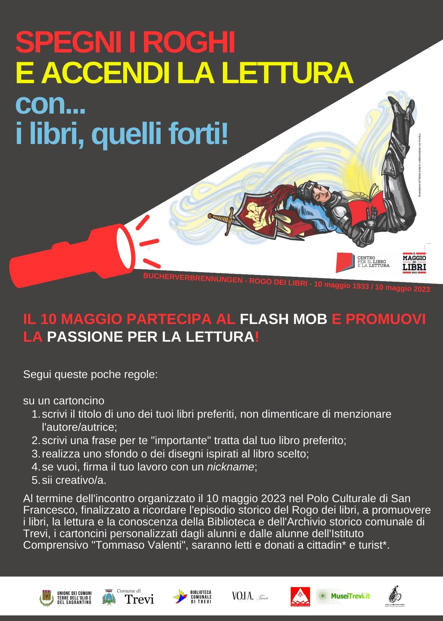 Al termine dell'incontro organizzato il 10 maggio 2023 nel Polo Culturale di San Francesco, finalizzato a ricordare l'episodio storico del Rogo dei libri, a promuovere i libri, la lettura e la conoscenza della Biblioteca e dell'Archivio storico comunale di Trevi, i cartoncini personalizzati dagli alunni e dalle alunne dell'Istituto Comprensivo "Tommaso Valenti", saranno letti e donati a cittadin* e turist*.