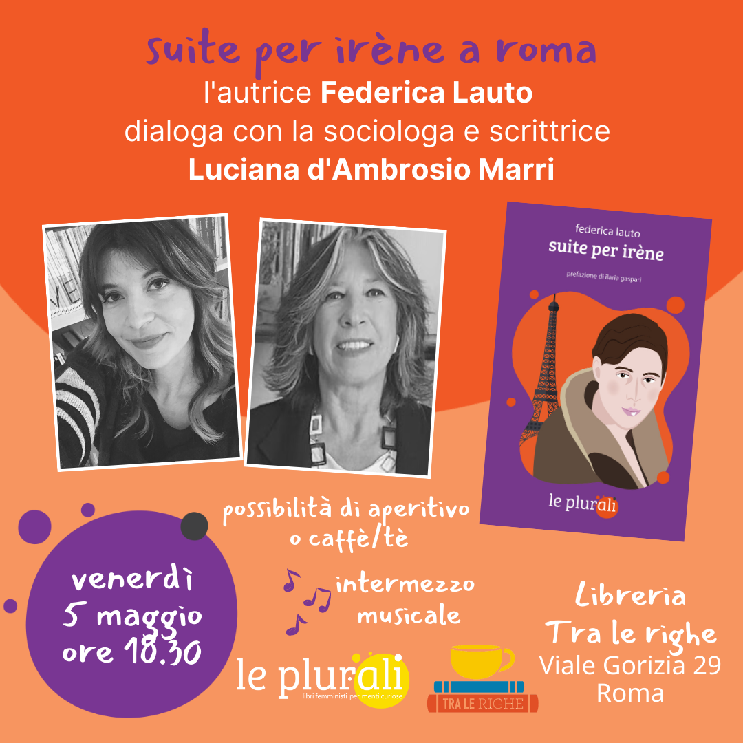 L'autrice Federica Lauto presenta il suo romanzo storico, Suite per Irène, alla Libreria Tra Le Righe di Roma. Dialoga con l'autrice la sociologa e scrittrice Luciana D'Ambrosio Marri. Interventi musicali. Durante l'evento è possibile fare un aperitivo.