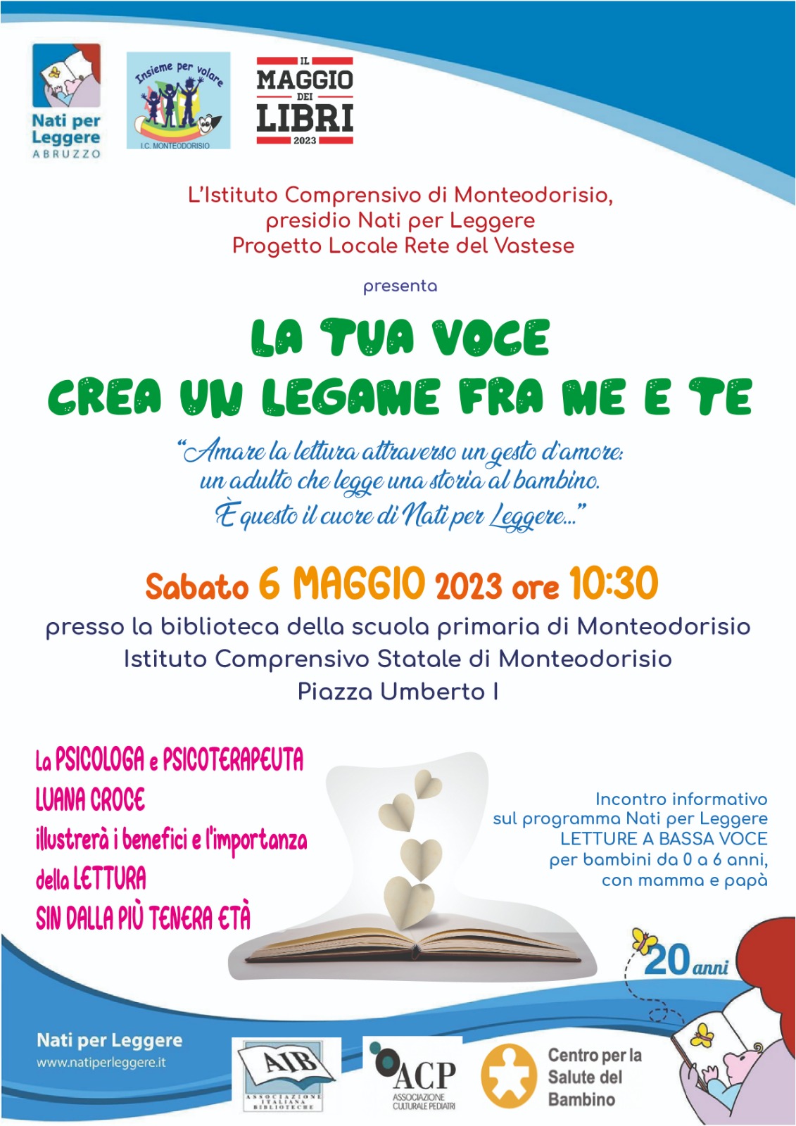LA VOCE DI UN GENITORE CHE LEGGE CREA UN LEGAME SOLIDO E SICURO CON IL BAMBINO CHE ASCOLTA. ATTRAVERSO LE PAROLE DEI LIBRI LA RELAZIONE SI INTENSIFICA , ESSI ENTRANO IN CONTATTO E SINTONIA GRAZIE AL FILO INVISIBILE DELLE STORIE E ALLA MAGIA DELLA VOCE . E' QUESTO IL CUORE DELL'INIZIATIVA PROMOSSA DAL PRESIDIO NATI PER LEGGERE DELL'ISTITUTO COMPRENSIVO DI MONTEODORISIO . L'INCONTRO , IN UNA DELLE BIBLIOTECHE DELL'ISTITUTO, VERRA' APERTO DA UNA PSICOLOGA E PSICOTERAPEUTA CHE SPIEGHERA' I BENEFICI DELLA LETTURA SIN DALLA PIU' TENERA ETA' , A SEGUIRE I PICCOLI LETTORI INSIEME A MAMMA E PAPA' ASCOLTERANNO DIVERSE LETTURE A CURA DELLE LETTRICI VOLONTARIE DELLA RETE LOCALE, ALLA FINE SPERIMENTERANNO UN MOMENTO DI LETTURA CONDIVISA INSIEME A MAMMA E PAPA' .