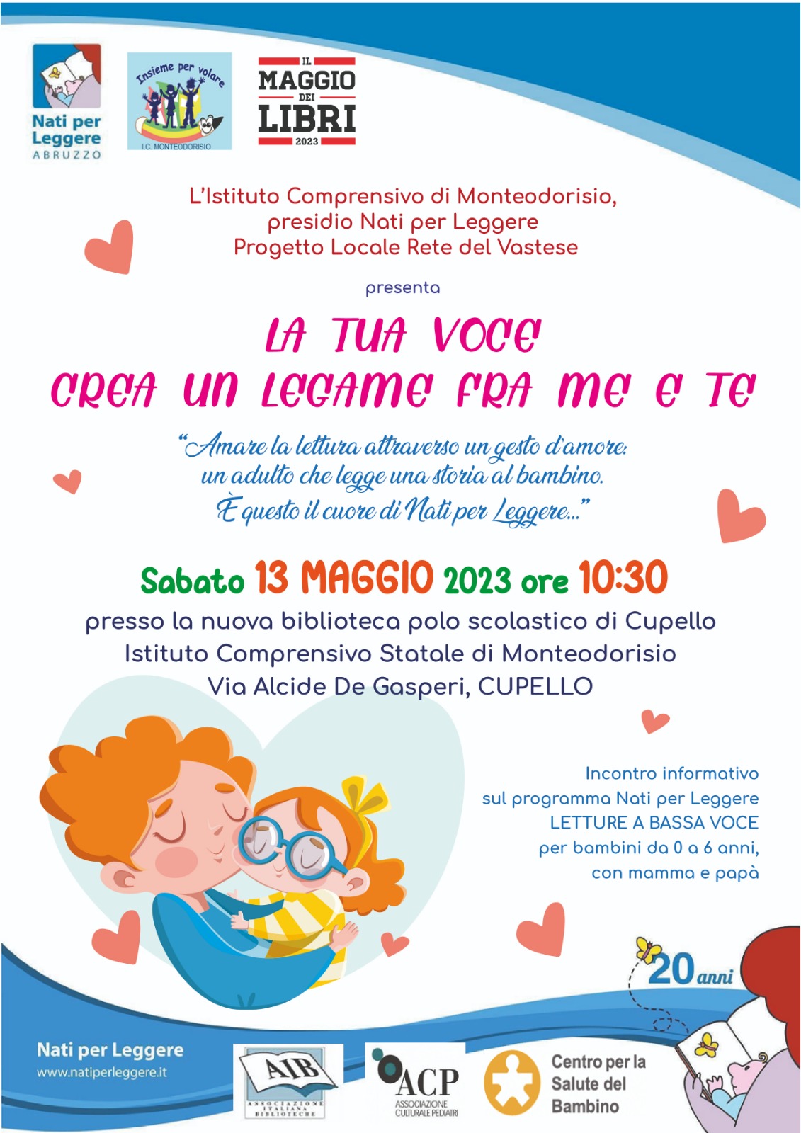 LA VOCE DI UN GENITORE CHE LEGGE UNA STORIA AL SUO BAMBINO CREA UN LINGUAGGIO COMUNE SULLE EMOZIONI E' UNA AZIONE STRAORDINARIA CHE PERMETTE DI APRIRE UN DIALOGO EMPATICO IN CUI IL BAMBINO SI SENTE ACCOLTO , RICONOSCIUTO, CAPITO... COME SCRIVEVA LEWIS CARROL , AUTORE DI ALICE NEL PAESE DELLE MERAVIGLIE ,: " LE STORIE SONO DONI D'AMORE, FUNZIONANO IN DUE DIREZIONI, ARRICCHISCONO CHI LI FA , PIU' ANCORA DI CHI LI RICEVE". E' QUESTO L'OBIETTIVO DELL'INCONTRO PROGRAMMATO DAL PRESIDIO NATI PER LEGGERE DELL'ISTITUTO COMPRENSIVO DI MONTEODORISIO. DOPO UNA BREVE ILLUSTRAZIONE DEL PROGRAMMA I BAMBINI INSIEME A MAMMA E PAPA' ASCOLTERANNO DIVERSE LETTURE A CURA DELLE LETTRICI VOLONTARIE DELLA RETE LOCALE ,SEGUIRA' UN PICCOLO LABORATORIO MANIPOLATIVO.