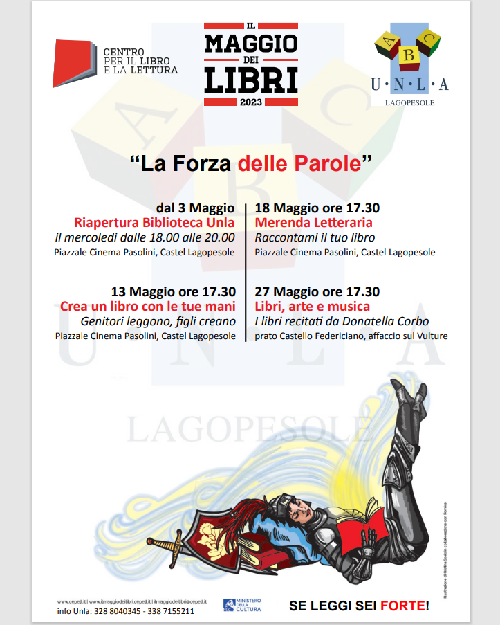 Riprendono le attività di promozione del libro e della lettura dell'UNLA di Lagopesole . L' UNLA, con la sua biblioteca, partecipa al Maggio dei Libri 2023 promosso dal MIC-Centro per il libro e la lettura, con una serie di iniziative rivolte per la maggior parte ai più piccoli, nell'intento di stimolare il piacere di leggere già da tenera età. Si parte da domani 3 maggio con la riapertura della biblioteca al prestito gratuito dei libri, per proseguire con altre iniziative in tutto il mese di maggio. Di seguito troverete le informazioni nella prima locandina alla quale seguirano quelle più specifiche per ogni singolo evento previsto nel cartellone .