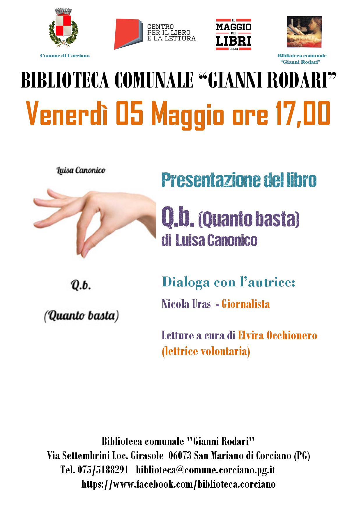 Presentazione del libro Q.b. (Quanto basta) di Luisa Canonico Dialoga con l’autrice: Nicola Uras - Giornalista Letture a cura di Elvira Occhionero (lettrice volontaria)