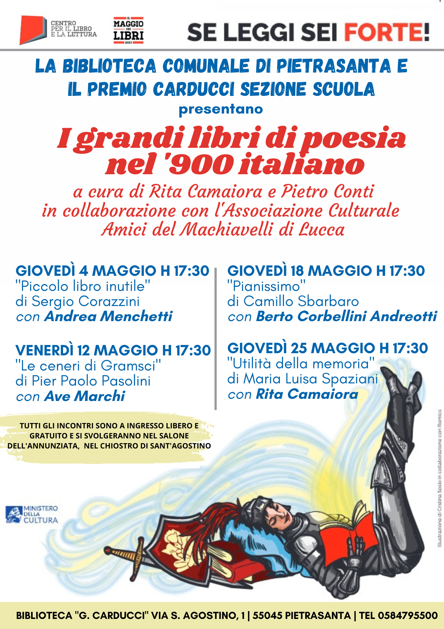 Il ciclo tematico di incontri è inserito nella XV edizione del Premio Carducci, Sezione Scuola. L'edizione 2023 è dedicata ai grandi libri di poesia del Novecento: incontri dedicati a poeti e poetesse del secondo Novecento di cui sarà proposta l'analisi di un libro della loro produzione poetica che possa costituire l'occasione per conoscere testi di poesia che hanno molto da dirci.