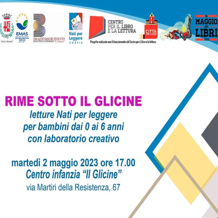 E’ il primo appuntamento del Nati per Leggere in questo Maggio dei Libri 2023 a Spoleto e si svolgerà martedì 2 maggio alle ORE 17:00 al Centro Infanzia “Il Glicine” di viale Martiri della Resistenza n. 67. Con “Rime sotto il Glicine” ci saranno letture per bambini e un laboratorio creativo a cura della Biblioteca comunale di Spoleto, del personale educativo degli asili nido comunali e dei volontari Nati per Leggere. L’attività è gratuita – si consiglia la prenotazione. Il centro infanzia “Il Glicine” - annesso all’asilo nido comunale - è uno spazio comunale polivalente dedicato a incontri per bambini e famiglie, a centro di documentazione delle attività degli asili nido comunali, a iniziative per genitori. L’iniziativa “Rime sotto il Glicine” - come altri appuntamenti NPL - è parte del progetto “Leggiamo! Lo spazio condiviso della lettura” realizzato con il finanziamento del Centro per il libro e la lettura con il bando Città che legge 2021. Maggio dei libri 2023: Terzo filone “Forti con le rime”.