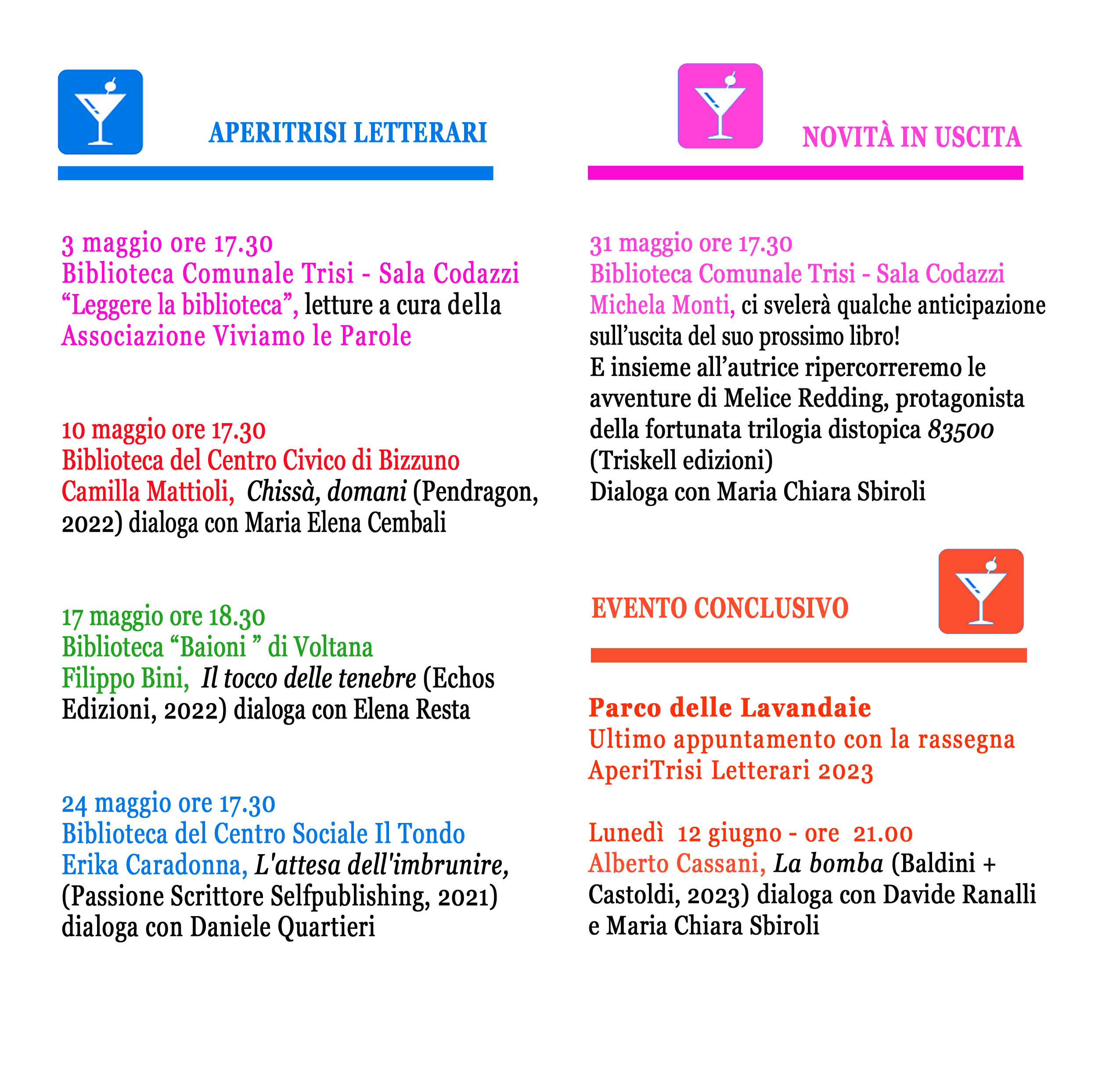 Ritorna il consueto appuntamento con gli AperiTrisi Letterari, organizzato dal Sistema Bibliotecario Urbano di Lugo e dalla Biblioteca Trisi in occasione della campagna nazionale “Il Maggio dei Libri", giunto ormai alla sua decima edizione. Una serie di incontri su tutto il territorio lughese che vedranno protagonisti autori e storie ambientate vicino a noi. Il primo appuntamento mercoledì 3 maggio ore 17,30 in Sala Codazzi della biblioteca, con un'apertura speciale pensata appositamente per l’occasione dall'Associazione Culturale Viviamo le Parole e dal titolo "leggere la biblioteca". Un sodalizio ormai consolidato quello con Viviamo le parole che porterà letture di brani ad alta voce, attraverso la narrazione di storie ambientate tutte attorno alla biblioteca. A seguire il 10 maggio alle 17.30 presso la Biblioteca del Centro Civico di Bizzuno, Camilla Mattioli presenterà il romanzo dal titolo Chissà, domani pubblicato da Pendragon, un libro che narra le vicende dell'ultimo anno della Maturità suo e dei suoi compagni! Una lettura scorrevole tutta dedicata ai giovani. Camilla sarà intervistata da Maria Elena Cembali. Camilla Mattioli è nata a Bologna nel 2001 e ha vissuto a Tokyo i suoi primi tredici anni. Rientrata in Italia, ha studiato al liceo Galvani di Bologna. Oggi è iscritta alla facoltà di fisica dell'Alma Mater Studiorum. Il 17 maggio ore 18.30, sarà la volta del giallo, presso la Biblioteca Baioni di Voltana con l'autore Filippo Bini e il suo "Il tocco delle tenebre" presentato dalla blogger romagnola Elena Resta. Seguiranno il 24 maggio Erika Caradonna con "L'attesa dell'imbrunire" presso la Biblioteca Del Centro Sociale il Tondo di Lugo. Il 31 maggio Michela Monti in Biblioteca Trisi, ci racconterà l'uscita del suo prossimo romanzo. Per concludere il 12 giugno al Parco delle Lavandaie con l’incontro con lo scrittore ravennate Alberto Cassani e il suo ultimo libro "La Bomba" edito da Baldini + Castoldi, 2023, presentato dal sindaco Davide Ranalli e dalla direttrice della Biblioteca Trisi, Maria Chiara Sbiroli.