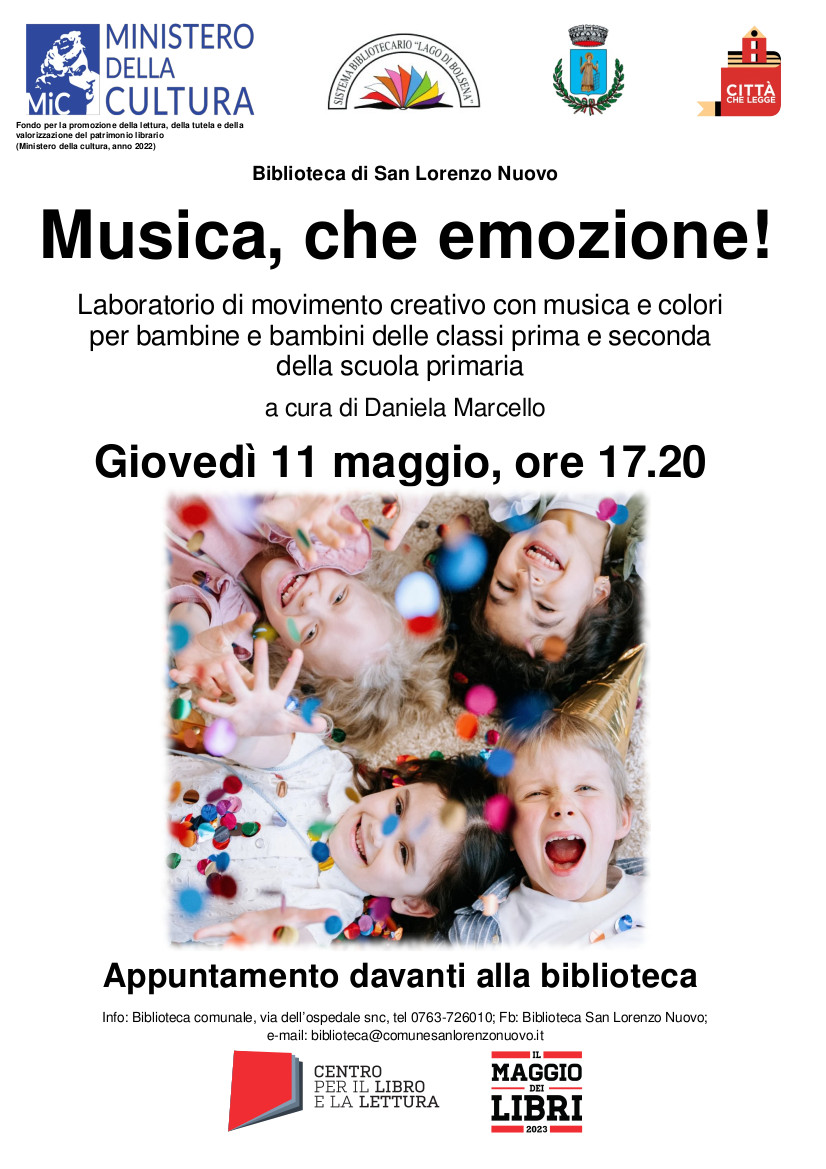 'Musica, che emozione!' è un laboratorio di movimento creativo, ideato da Daniela Marcello, attrice e danzaterapeuta, esperta di teatro e teatro-danza. Il laboratorio consiste in un processo di tipo creativo e artistico, che promuove una benefica influenza su capacità psico-motorie, orientamento nello spazio, armonizzazione tra ritmo interno e ritmo esterno, un gioco spontaneo e libero alla scoperta delle proprie potenzialità e all'espressione della propria immaginazione e delle proprie emozioni attraverso l'interazione tra movimento corporeo, musica e colori.