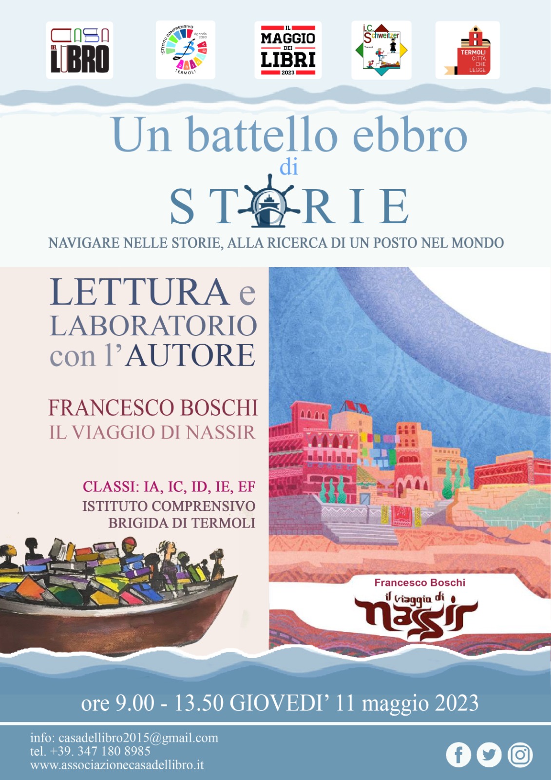 Nell'ambito di un progetto in rete sul territorio, dal titolo "Un battello ebbro di storie", gli alunni e le alunne di cinque classi 1^ della secondaria di primo grado dell'Istituto comprensivo Brigida di Termoli (CB) incontreranno l'autore de "Il Viaggio di Nassir", racconto ambientato nel bellissimo, martoriato e dimenticato Yemen, nel quale si parla di libri, di gioia, di paesi bellissimi, di dignità, di guerra, di fatica, di cooperazione, di diversità, di meraviglia, di speranza, di opportunità. Saranno forniti tanti spunti da cui poter partire per approfondire, insieme ai partecipanti all'incontro, le varie tematiche, le diverse emozioni, le possibili soluzioni al fine di seminare, per e con i ragazzi e le ragazze in ascolto, germogli di consapevolezza e di possibilità umane, per una visione solidale e partecipativa rispetto alle tante realtà che ci sembrano distanti ma che, in realtà, ci travolgono e ci coinvolgono. Il messaggio, lanciato e lasciato forte e chiaro, sarà che la guerra non è MAI una soluzione, ma è sempre privazione, paura, incognita, distruzione, prevaricazione, abbandono.