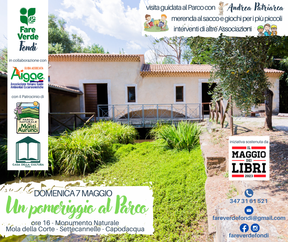 L'Associazione Ambientalista Fare Verde, Gruppo Locale di Fondi (Latina), organizza per Domenica 7 Maggio dalle ore 16 l'iniziativa "Un pomeriggio al Parco", con il Patrocinio del Parco Regionale dei Monti Aurunci, la Casa della Cultura e la collaborazione della Guida Ambientale Escursionistica Andrea Patriarca.