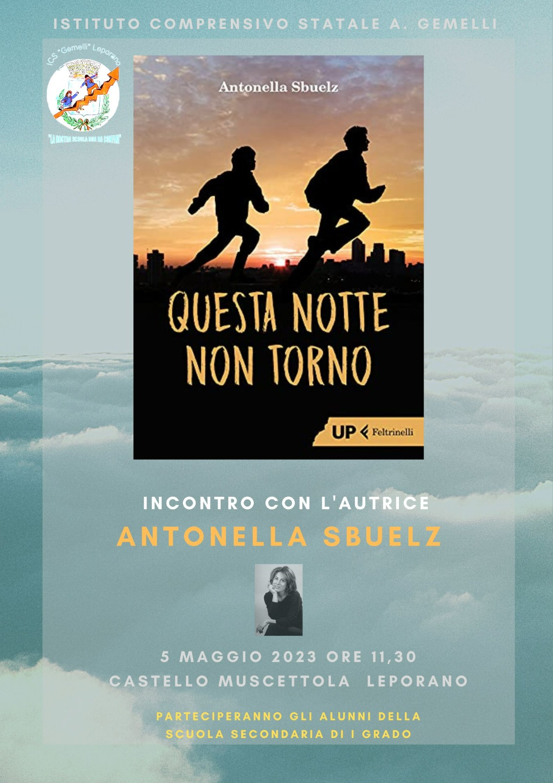 Gli alunni delle classi terze della Scuola Secondaria di I grado "C.A. Dalla Chiesa" dell'ICS "A. Gemelli" di Leporano incontreranno, l'autrice Antonella Sbuelz presso il Castello Muscettola di Leporano; che presenterà il libro " Questa notte non torno".