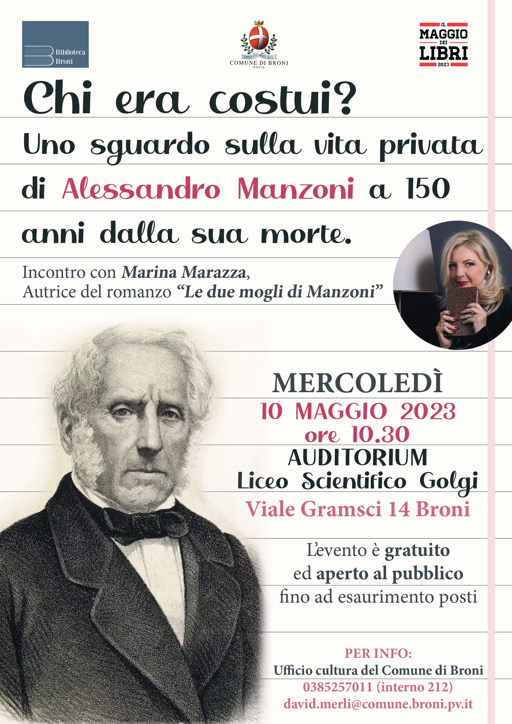 Incontro con Marina Marazza, Autrice del romanzo "Le due mogli di Manzoni". L’evento si svolgerà nell’aula magna del liceo scientifico Golgi in viale Gramsci, 14, a Broni il 10 maggio alle ore 10.30. Questo incontro spettacolarizzato con l’autore, legato al romanzo “Le due mogli di Manzoni”, sarà corredato di immagini di approfondimento su slide di Power Point ed avrà la durata di un’ora abbondante più domande del pubblico.