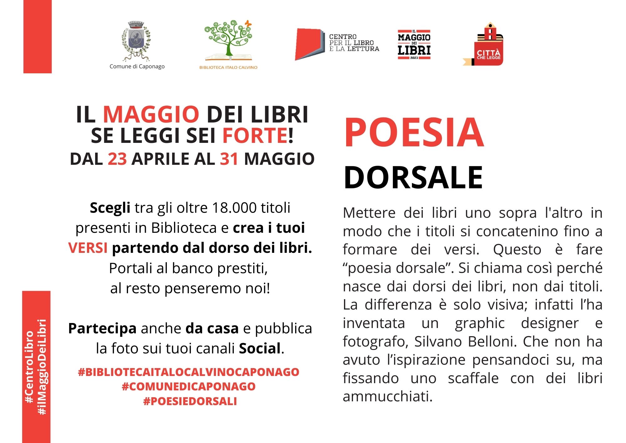 La poesia è un potente mezzo espressivo che combina parole e ritmo, permette di esternare sentimenti e emozioni, aiuta a esplorare il proprio poeta interiore. Per tutto il periodo dell’iniziativa, la sfida proposta si avvale dei libri per creare versi partendo dai loro titoli. Le persone vengono invitate a scovare tra gli scaffali della biblioteca i titoli giusti per comporre una frase che abbia senso compiuto e che possa rappresentare un breve verso. I volumi scelti vengono sovrapposti in modo che i titoli posti sul dorso siano leggibili come una poesia. I gruppi di libri saranno, legati tra loro, fotografati e esposti in apposito spazio con il nome dell’autore/autrice. È possibile partecipare al contest anche con i libri di casa, fotografandoli e pubblicando la foto sul proprio profilo con gli hashtag #poesiedorsali #bibliotecaitalocalvinocaponago