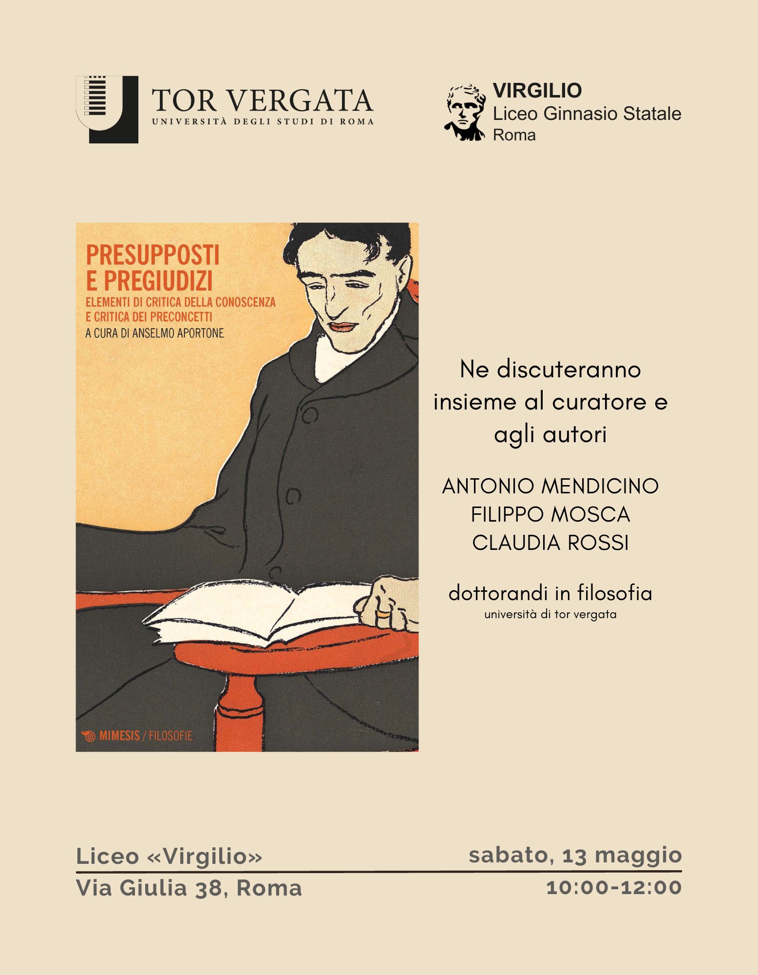 Il 13 maggio dalle ore 10 alle ore 12, dottorandi in filosofia dell'Università di Roma "Tor Vergata" presenteranno e discuteranno al Liceo Ginnasio Statale «Virgilio» - Via Giulia 38, Roma, i temi affrontati nel volume in uscita presso l'editore Mimesis *Presupposti e pregiudizi. Elementi di critica della conoscenza e critica dei preconcetti*, a cura di Anselmo Aportone. L'incontro con gli studenti del Liceo è aperto al pubblico. Saranno presenti anche gli autori.