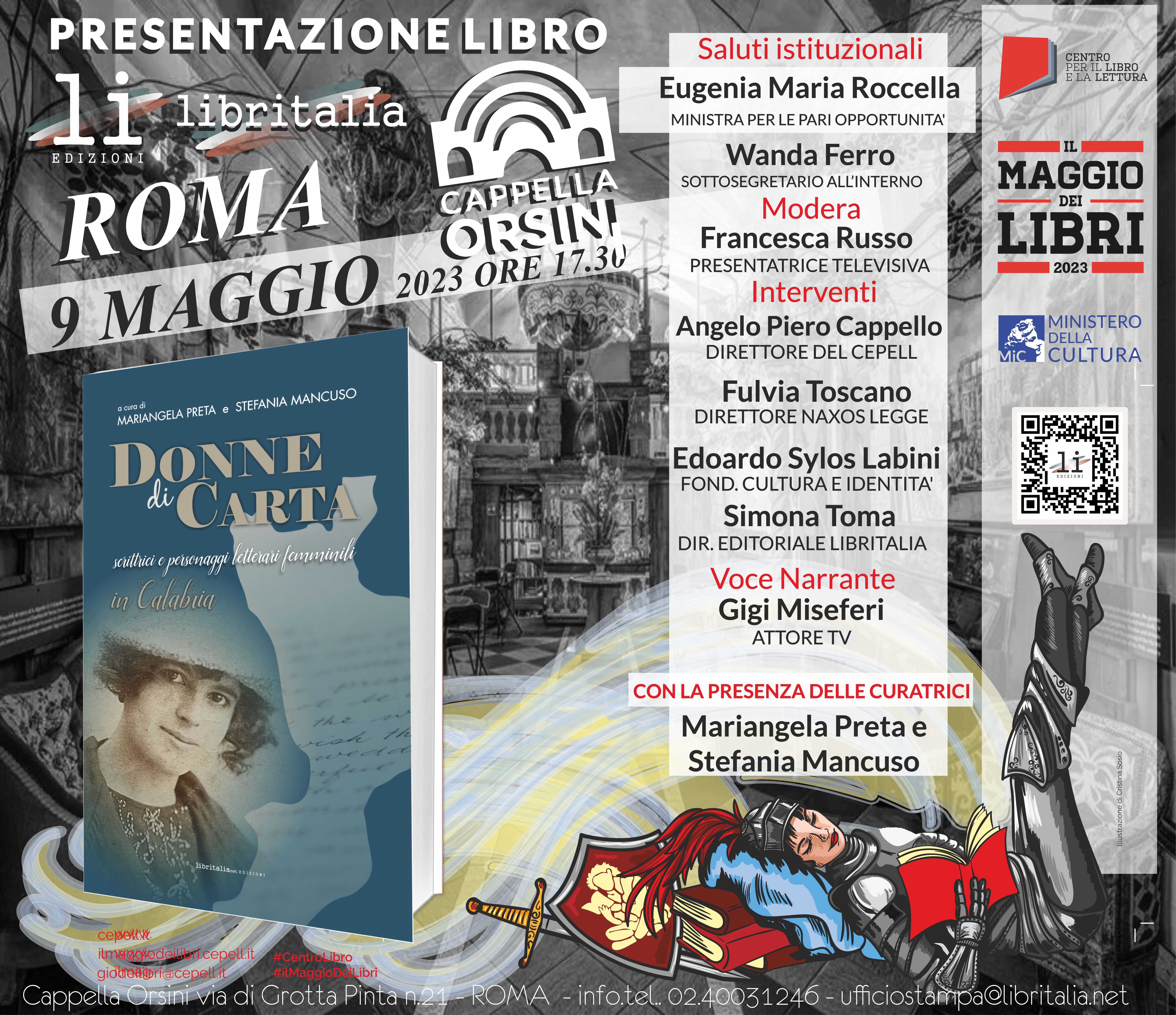 La prima presentazione ufficiale del volume "donne di carta" edito da libritalia, un volume che nasce dalla prima edizione de "La Calabria delle donne - Festival del genio femminile in Calabria. L'evento, ideato dapprima in Sicilia da Fulvia Toscano e Marinella Fiume (direttrici artistiche della Sicilia delle donne e Naxos Legge), ha avuto Luogo nel fatidico mese di marzo 2022 ed ha visto come protagonista il multiforme ingegno declinato dalle donne in molteplici settori, in una pluralità di prospettive e di competenze: dall'Arte alla Matematica dalla Letteratura all'Astronomia all' Arte di governo al Giornalismo alla Filosofia..., talora un vero e proprio primato misconosciuto o obliato! Il volume raccoglie 36 schede di scrittrici di origine calabrese o di donne che, non calabresi, della Calabria si sono nutrite e con la Calabria hanno avuto relazioni e rapporti intensi tanto da Lasciarne traccia in opere scritte. - (Mariangela Preta e Stefania Mancuso). Tra queste "Donne di carta”, c'è chi ha avuto una vita breve, chi lunga, chi lunghissima. Per tutte, La “carta" ha avuto a che fare con la propria personalità, prima che con il loro mestiere. Tutta La Calabria - settentrionale, centrale, meridionale - è da loro rappresentata. - (Pasqualino Pandullo Caporedattore TGR Rai Calabria) Non è un omaggio alle donne, questo libro. Al contrario, queste "Donne di carta” sono il riconoscimento dovuto a quella parte di cielo senza La quale nulla sarebbe identico a ciò che è. Grazie alle “donne di carta” di questo volume, ma grazie anche a chi, donna anche lei, ha trovato tempo forza e coraggio di restituire a queste donne la loro unica possibilità di sopravvivenza: La Lettura.