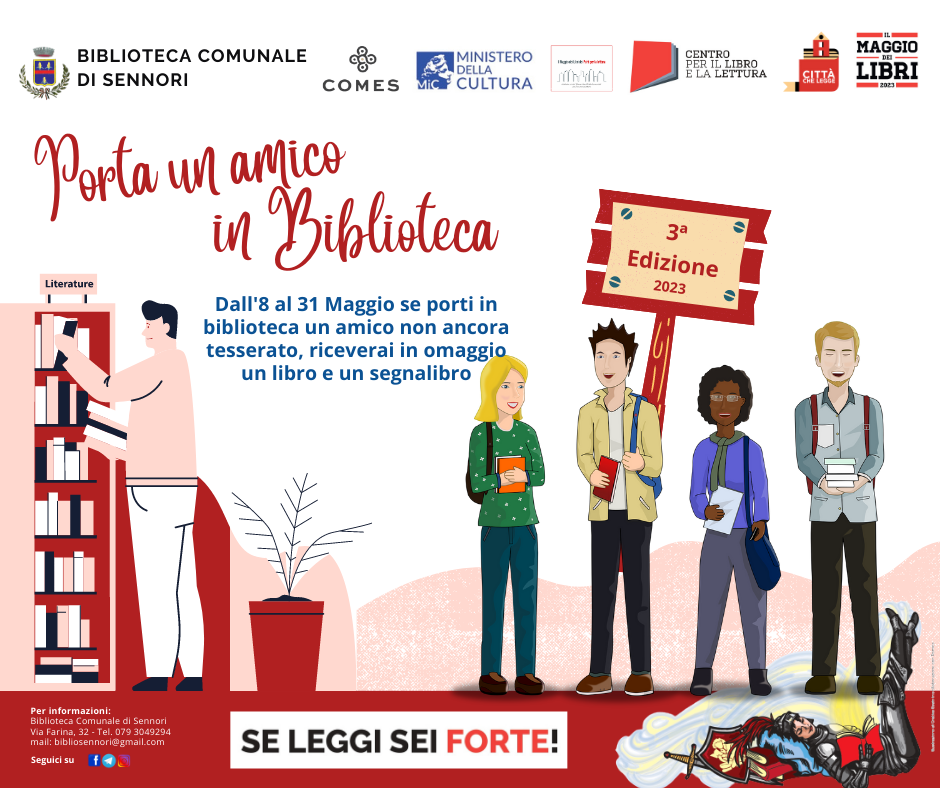 Terza edizione dell'iniziativa "Porta un amico in Biblioteca". Dall'8 al 31 maggio chiunque porti un amico non ancora tesserato in biblioteca per far conoscere i servizi, le attività e le opportunità che offre, riceverà in dono un libro e un segnalibro!