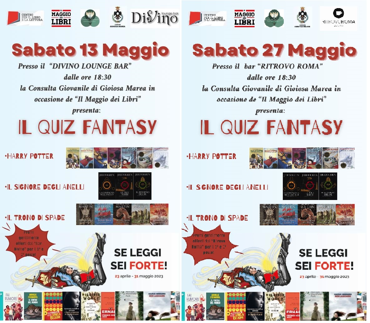 Coinvolgente quiz curato e Gestito dalla Consulta Giovanile di Gioiosa Marea per gli esperti, i fan e gli estimatori della fantastica trilogia del Signore degli Anelli, di Harry Potter e del Trono di Spade. che potranno dimostrarlo in questo simpatico test che si svolgerà il 13 maggio presso il Bar Divino ed il 27 maggio presso il Bar Roma, rispondendo alle molteplici domande.