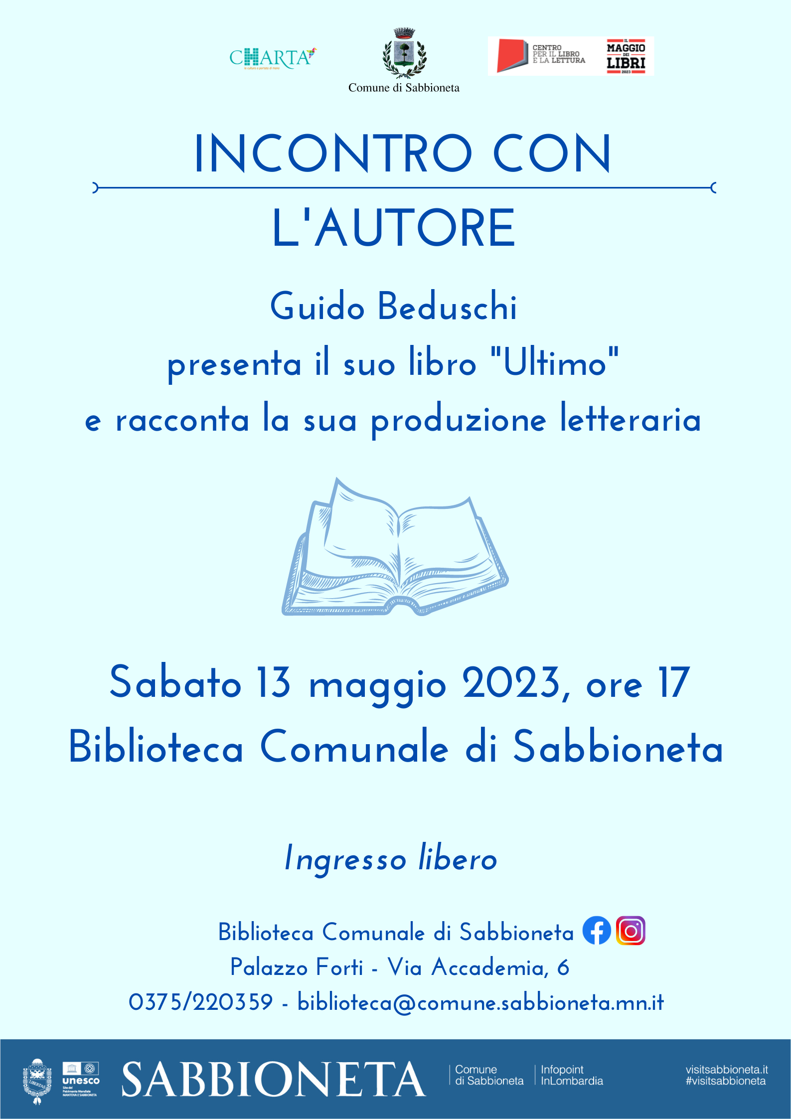 INCONTRO CON L'AUTORE Guido Beduschi presenta il suo libro "Ultimo" e racconta la sua produzione letteraria. Sabato 13 maggio 2023, ore 17 Biblioteca Comunale di Sabbioneta