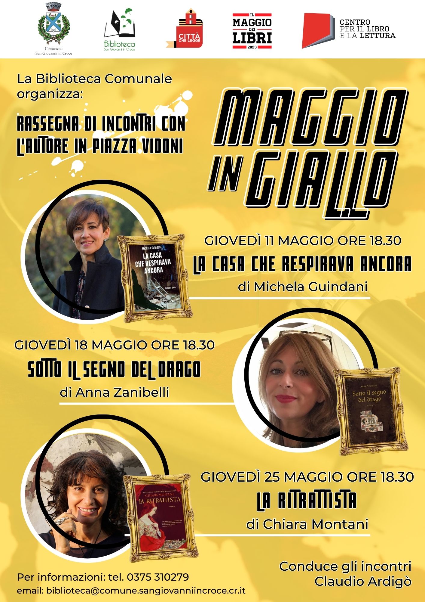 San Giovanni in Croce si tinge di giallo: dall’11 al 25 di questo mese arriva “Maggio in giallo”, rassegna culturale di incontri con l’autore organizzata dalla Biblioteca Comunale in occasione della campagna nazionale “Il Maggio dei Libri” promossa dal Centro per il libro e la lettura di Roma e il Ministero della Cultura. Tutti gli appuntamenti si terranno in Piazza Vidoni, con inizio alle ore 18.30, e saranno condotti dal critico letterario Claudio Ardigò. “Sarà una rassegna tutta al femminile – commenta la responsabile della biblioteca Ardea Mainardi - che siamo certi interesserà tutti gli appassionati del genere giallo”.