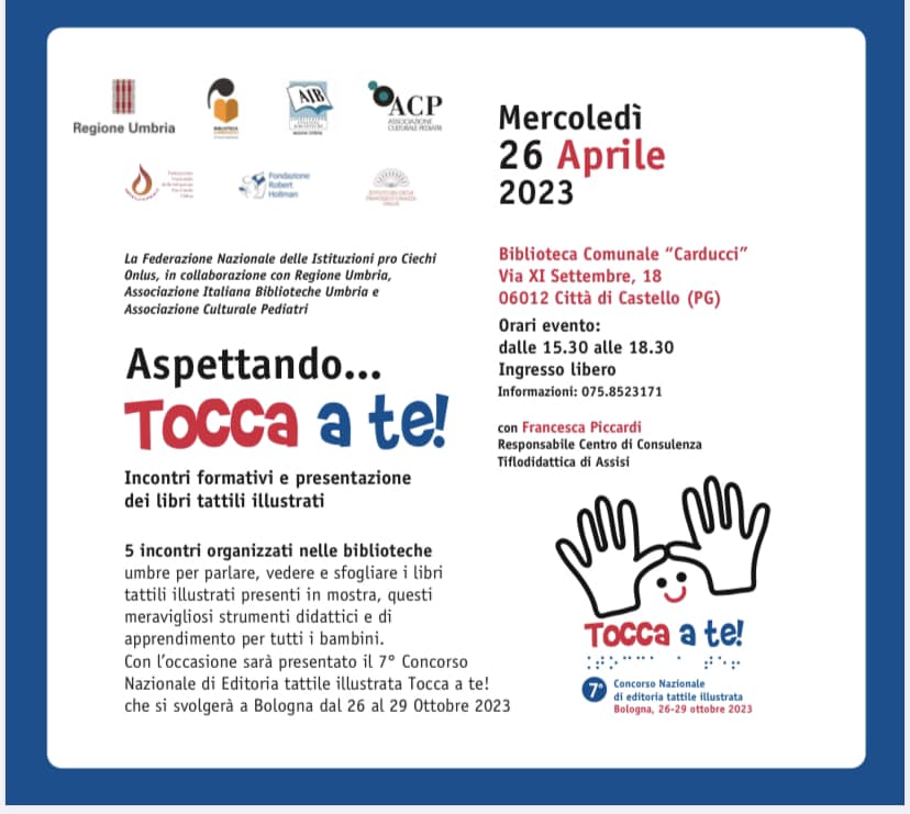 Incontro per parlare, vedere e sfogliare i libri tattili presenti in mostra, meravigliosi strumenti didattici e di apprendimento per tutti i bambini. Con l'oxccasione sarà presentato il 7° Concorso Nazionale di editoria tattile illustrata "Tocca a te!" che si svolgerà a Bologna dal 26 al 29 ottobre 2023.
