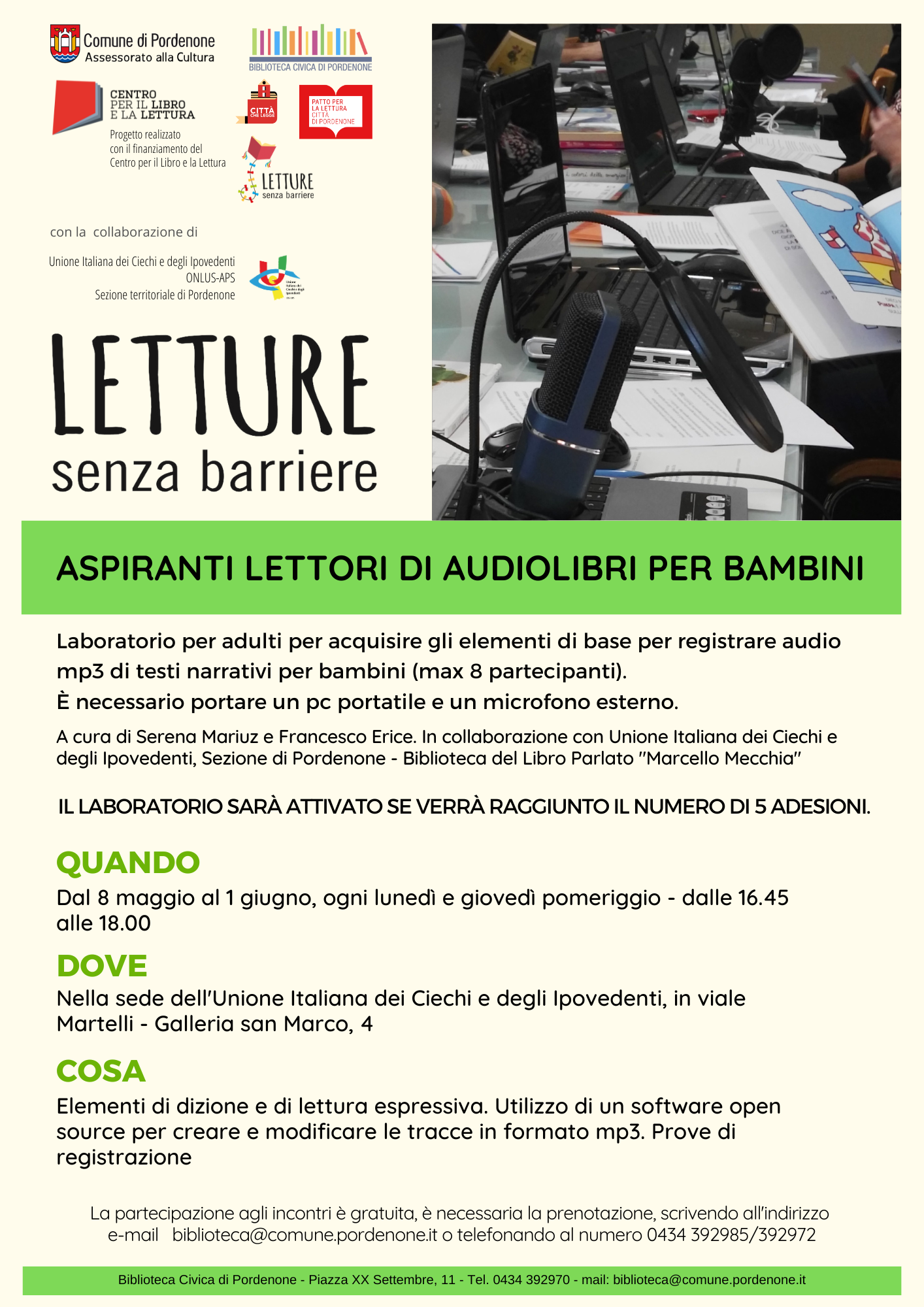 Laboratorio per adulti per imparare a registrare audio mp3 di testi narrativi per bambini, a cura di Serena Mariuz e Francesco Erice, organizzato in collaborazione con la Biblioteca del Libro Parlato “Marcello Mecchia” dell’Unione Italiana dei ciechi e degli Ipovedenti di Pordenone.