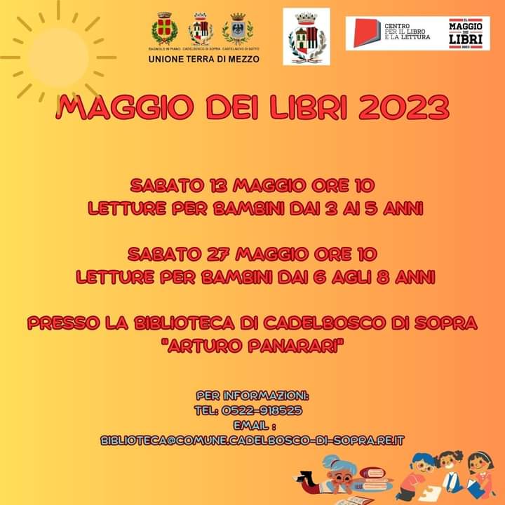 Sabato 13 maggio 2023 alle ore 10 letture per bambini dai 3 ai 5 anni. Tema libero. Sabato 27 maggio 2023 alle ore 10 letture per bambini dai 6 agli 8 anni. Tema libero.