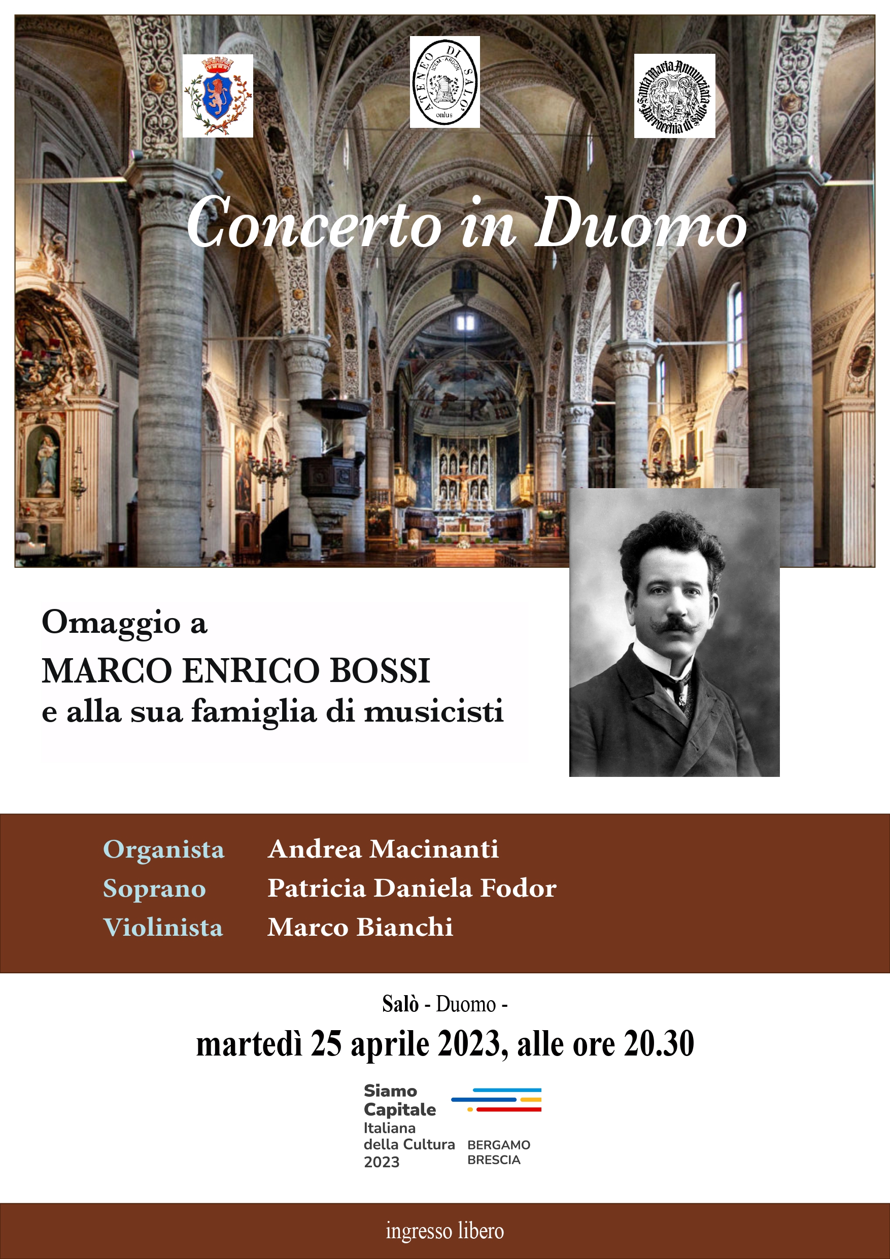 Presentazione del volume di Andrea macinanti "L'opera organistica di Marco Enrico Bossi", evento accompagnato da un concerto presso il Duomo di Salò. Organista: Andrea Macinanti, soprano: Patricia Daniela Fodor, violinista: Marco Bianchi.