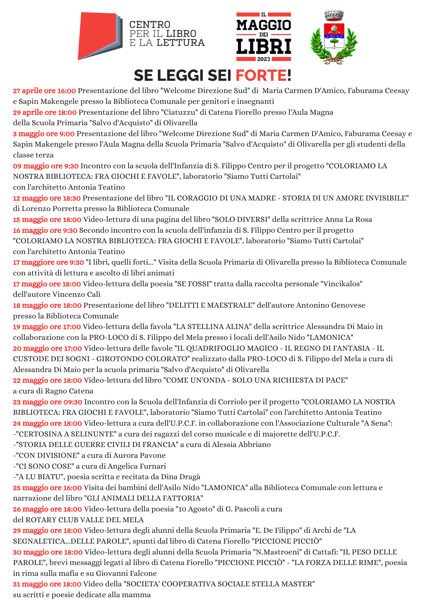 Calendario iniziative Comune S.Filippo del Mela "Maggio dei Libri" UNIQUE CODE: 202304179