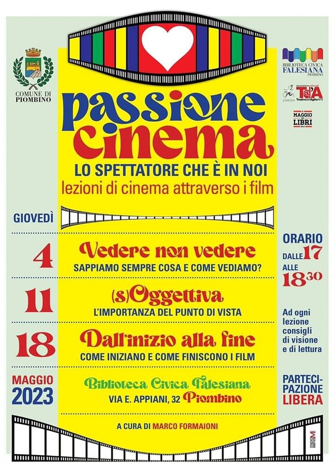 "Passione Cinema. Lo spettatore che è in noi" lezioni di cinema attraverso i film, a cura di Marco Formaioni. Tre appuntamenti che si terranno in biblioteca nei primi tre giovedì di maggio, dalle ore 17 alle ore 18.30. Ad ogni lezione consigli di visione e di lettura per un approccio al cinema da semplici spettatori curiosi e desiderosi di approfondire il linguaggio e l'analisi dei film.