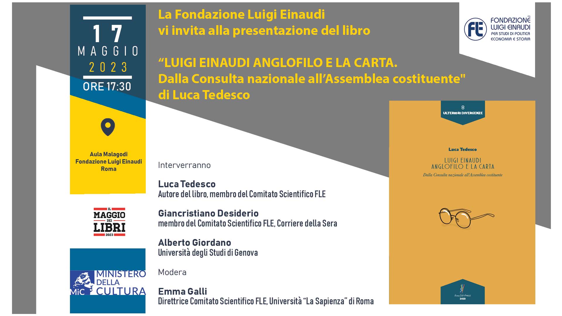 Il giorno 17 maggio 2023 alle ore 17:30 si terrà la presentazione del libro “LUIGI EINAUDI ANGLOFILO E LA CARTA. Dalla Consulta nazionale all’Assemblea costituente” del Prof. Luca Tedesco.