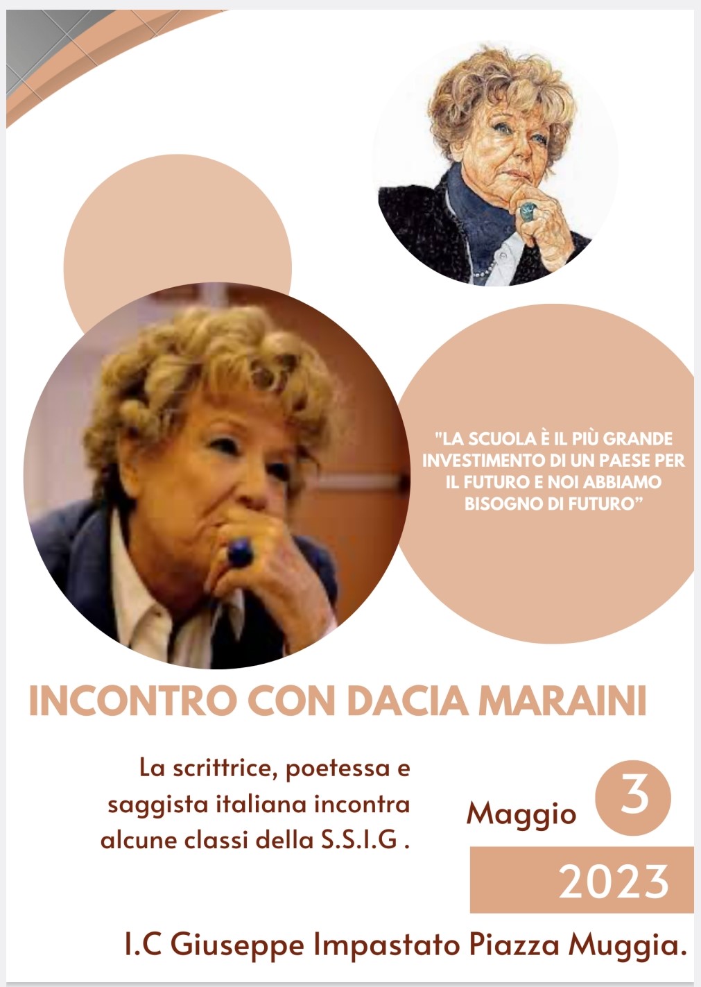 Incontro con l'autrice Dacia Maraini. Laboratorio di lettura sui romanzi Onda Marina e Drago Spento. Preparazione di domande e riflessioni insieme all'autrice. Gli alunni hanno realizzato degli onepager.
