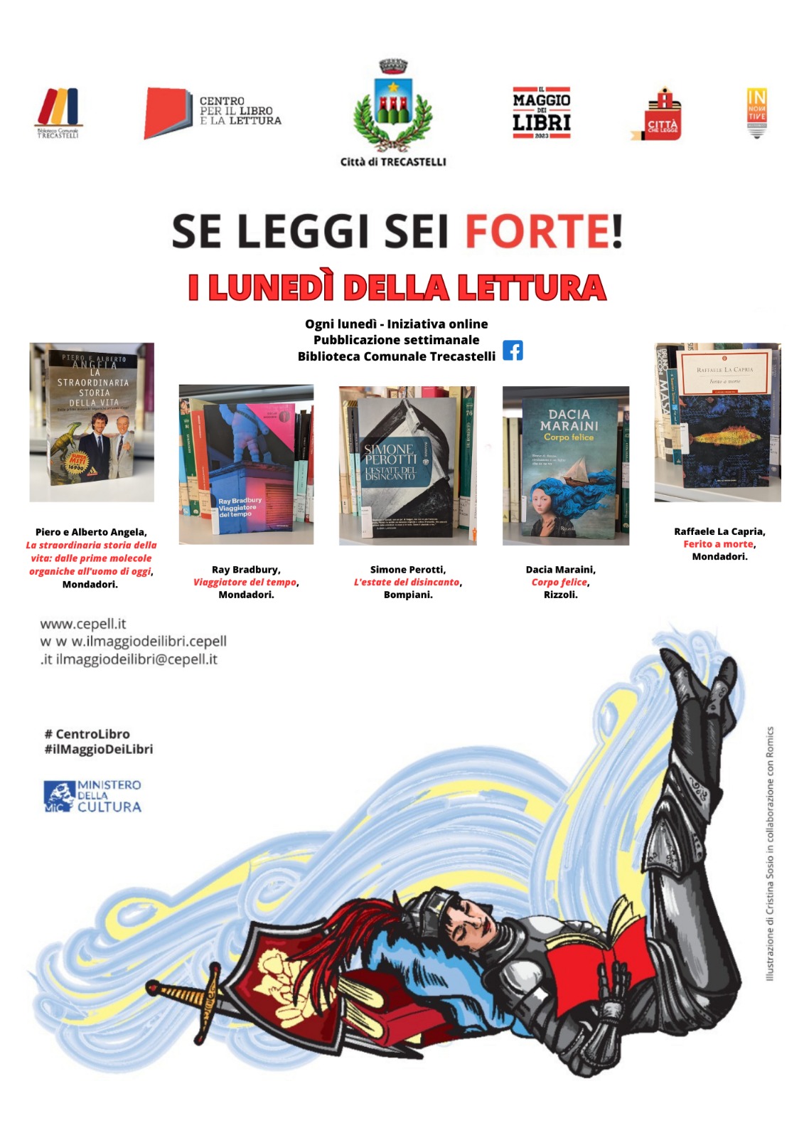 "I lunedì della lettura" è un progetto della Biblioteca Comunale di Trecastelli, promosso dal Comune di Trecastelli, che prevede la pubblicazione sul portale social della Biblioteca, ogni lunedì, di un nuovo libro proposto per la lettura e disponibile al prestito presso la Biblioteca Comunale.
