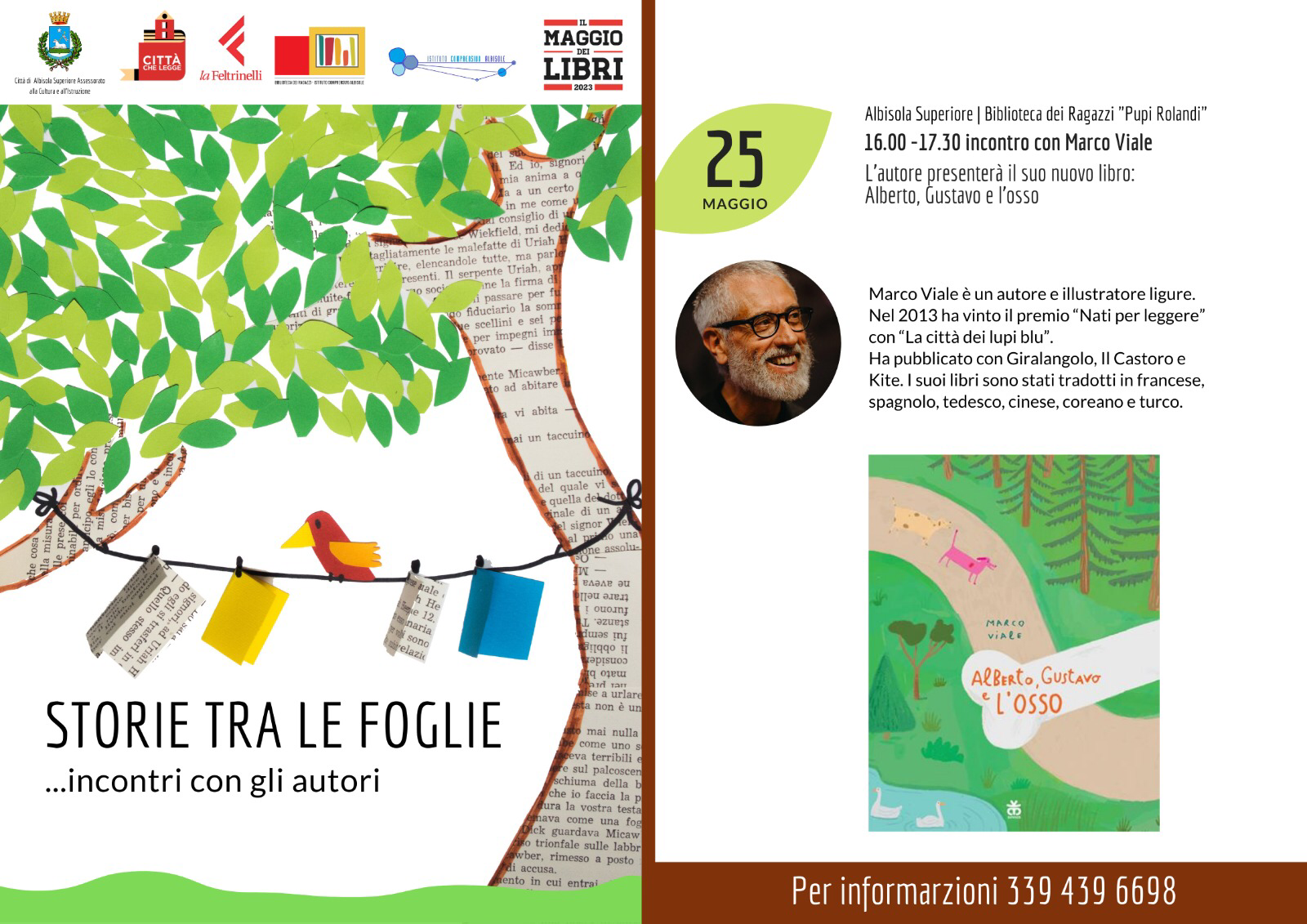 Percorso di letture ad alta voce degli albi illustrati dell'autore illustratore Marco Viale, con laboratori di comprensione e discussione del racconto. Il percorso si è concluso con un incontro con l'autore per le singole classi. In orario pomeridiano si è svolto anche un incontro per bambini e famiglie. Albi illustrati e letti: "La città dei lupi blu", "Io sono il re", "Nessuno mi crede", "Alberto, Gustavo e l'osso".
