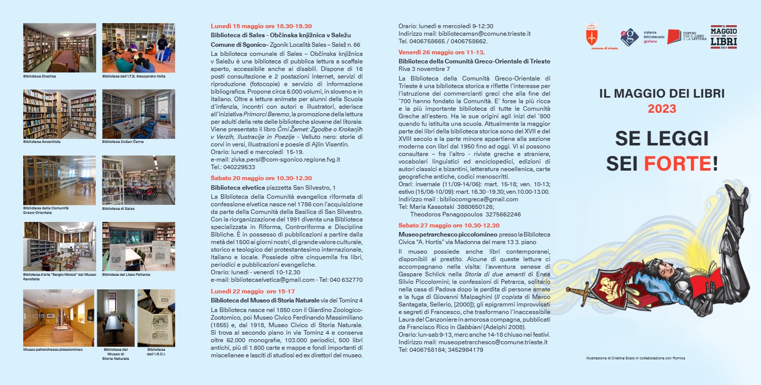 Dal 5 al 27 maggio il Sistema Bibliotecario Giuliano aderisce a Il Maggio dei libri, manifestazione promossa dal CEPeLL, il «Centro per il Libro e la lettura» del Ministero della Cultura. La campagna , giunta ormai alla tredicesima edizione, quest’anno ha per slogan “Se leggi sei forte!”, che promuove la lettura come risorsa interiore, in grado di rendere cittadini informati e consapevoli.