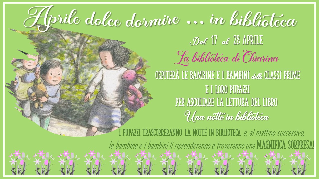 Anche nella nostra biblioteca scolastica di via MILLET,21, il bibliopoint “La biblioteca di Chiarina”, i bambini delle classi PRIME hanno ricevuto un INVITO PERSONALE per recarsi ad ascoltare, nei giorni che vanno dal 17 al 28 aprile, la lettura del libro “Una notte in biblioteca “, insieme al loro pupazzo o peluche preferito. Ogni gruppo classe ascolterà la narrazione del libro e, dopo la lettura, saluterà i propri pupazzi per lasciarli a dormire nella piccola accogliente stanza, circondati da magici albi illustrati. Quando il mattino successivo torneranno a riprenderlo scopriranno che i pupazzi hanno scelto , per ognuno di loro ,una bellissima sorpresa da sfogliare e leggere insieme alle proprie maestre e ai propri familiari.