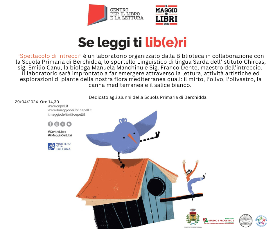 "Spettacolo di intrecci" è un laboratorio organizzato dalla Biblioteca Comunale in collaborazione con la Scuola Primaria del Comune di Berchidda. "Le piante nella tradizione popolare della Sardegna" sarà il libro guida per il laboratorio. Un artigiano locale, insieme ai bambini, intreccerà il cestino con piante di olivo, olivastro, salice bianco e canna.