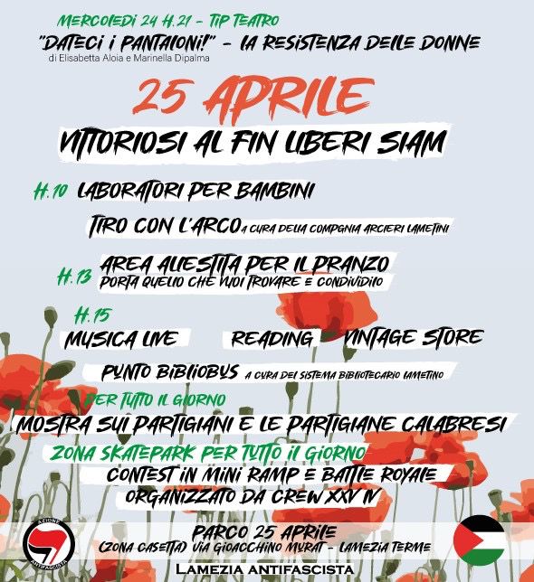 Laboratori per bambini, tiro con l'arco, area allestita per il pranzo, musica live, reading, pintage store, Punto Bibliobus, Mostre fotografiche sui partigiani e le partigiane calabresi, zona skate park tutto il giorno.