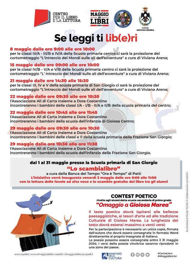Evento organizzato dal Comune di Gioiosa Marea con la fattiva collaborazione dell'istituto Comprensivo "Anna Rita Sidoti", associazioni, editori e librerie. Nelle scuole del territorio, dall’infanzia alla primaria alla secondaria di primo grado, da San Giorgio al centro, sono state programmati momenti di lettura, proiezioni di cortometraggi sui filoni del Maggio dei Libri,