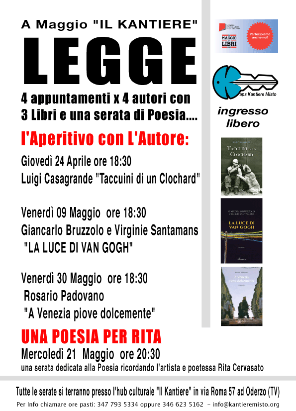 Un'ulteriore iniziativa per il Maggio dei Libri si terrà Mercoledì 21 maggio ed è "Una Poesia per Rita". Una serata dedicata alla Poesia e all'artista e poetessa Opitergina, da poco scomparsa, Rita Cervasato. L'incontro si svolgerà sempre presso l'hub culturale "Il Kantiere", in via Roma 57 ad Oderzo (TV) a partire dalle ore 20:45. Sarà una serata a ingresso e leggio libero, dove poeti e appassionati di poesia potranno incontrarsi, confrontarsi e scambiarsi emozioni, letture e suggerimenti.