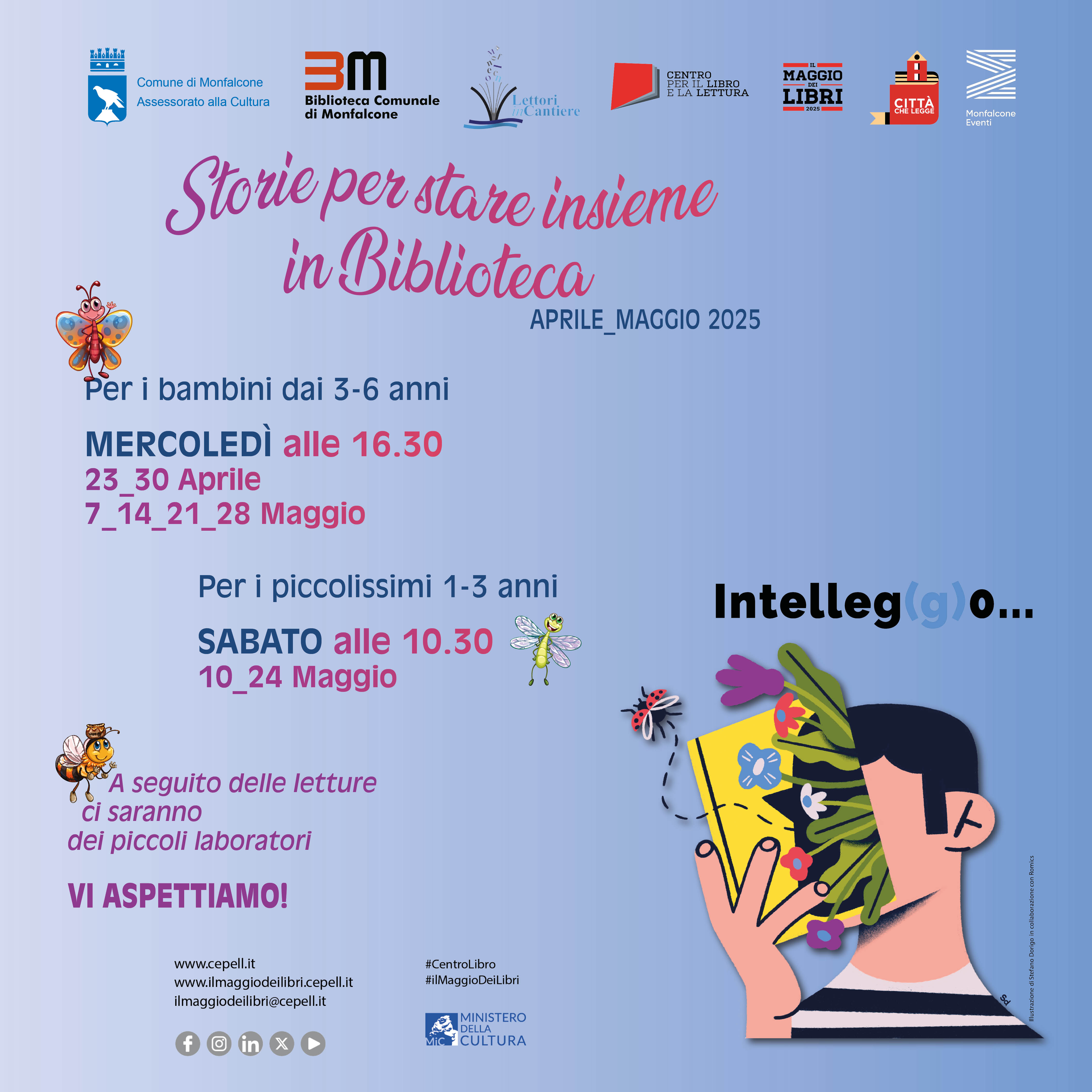 Letture per i bambini dai 3-6 anni: MERCOLEDÌ 23 e 30 aprile e 7, 14, 21, 28 maggio alle 16.30. Letture per i piccolissimi 1-3 anni: SABATO 10 e 24 maggio alle 10.30. A seguito delle letture sono previsti dei piccoli laboratori.