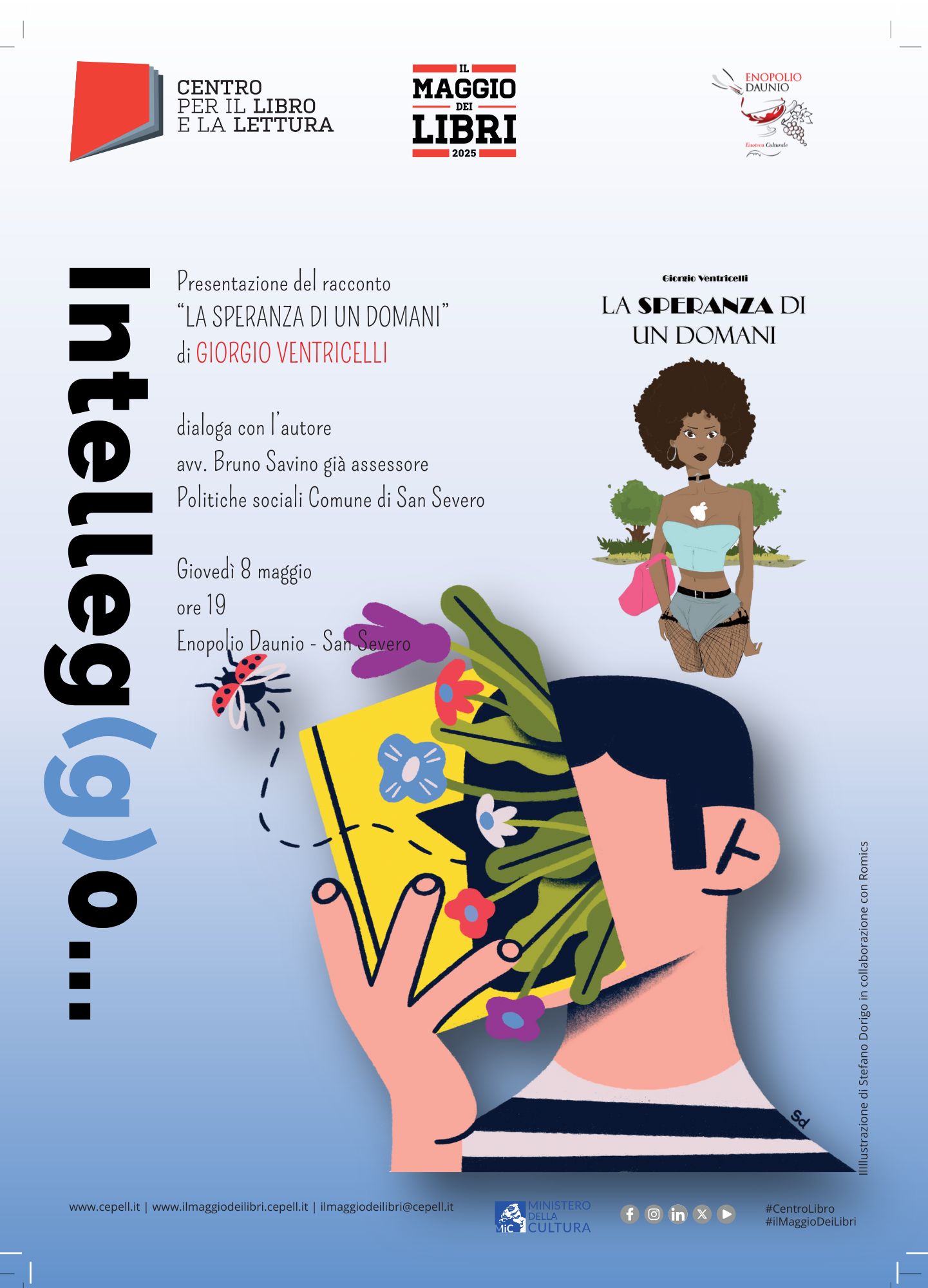 "La speranza di un domani" è un racconto scritto dal sociologo e giornalista Giorgio Ventricelli, pubblicato il 4 aprile 2024. Il libro affronta temi come l'ipocrisia sociale, l'umanità smarrita e la riscoperta dell'empatia attraverso le storie di donne invisibili e uomini che vivono nella menzogna. Il protagonista, volutamente senza nome, rappresenta coloro che, per convenienza personale, adottano comportamenti lontani dall'etica e dal senso civico. Il racconto invita il lettore a riflettere su chi realmente vive nella menzogna, utilizzando scappatoie morali o sotterfugi da classe dominante, Nel 2008, il racconto ha vinto la sezione scrittura della III edizione del "Premio per la Pace e i Diritti Umani", organizzato dal Comitato per la Pace e i Diritti umani della Regione Abruzzo. L'incontro si terrà sulla terrazza panoramica di Enopolio Daunio a San Severo (FG): in caso di pioggia o maltempo, la presentazione si terrà al coperto, nell'enoteca culturale.