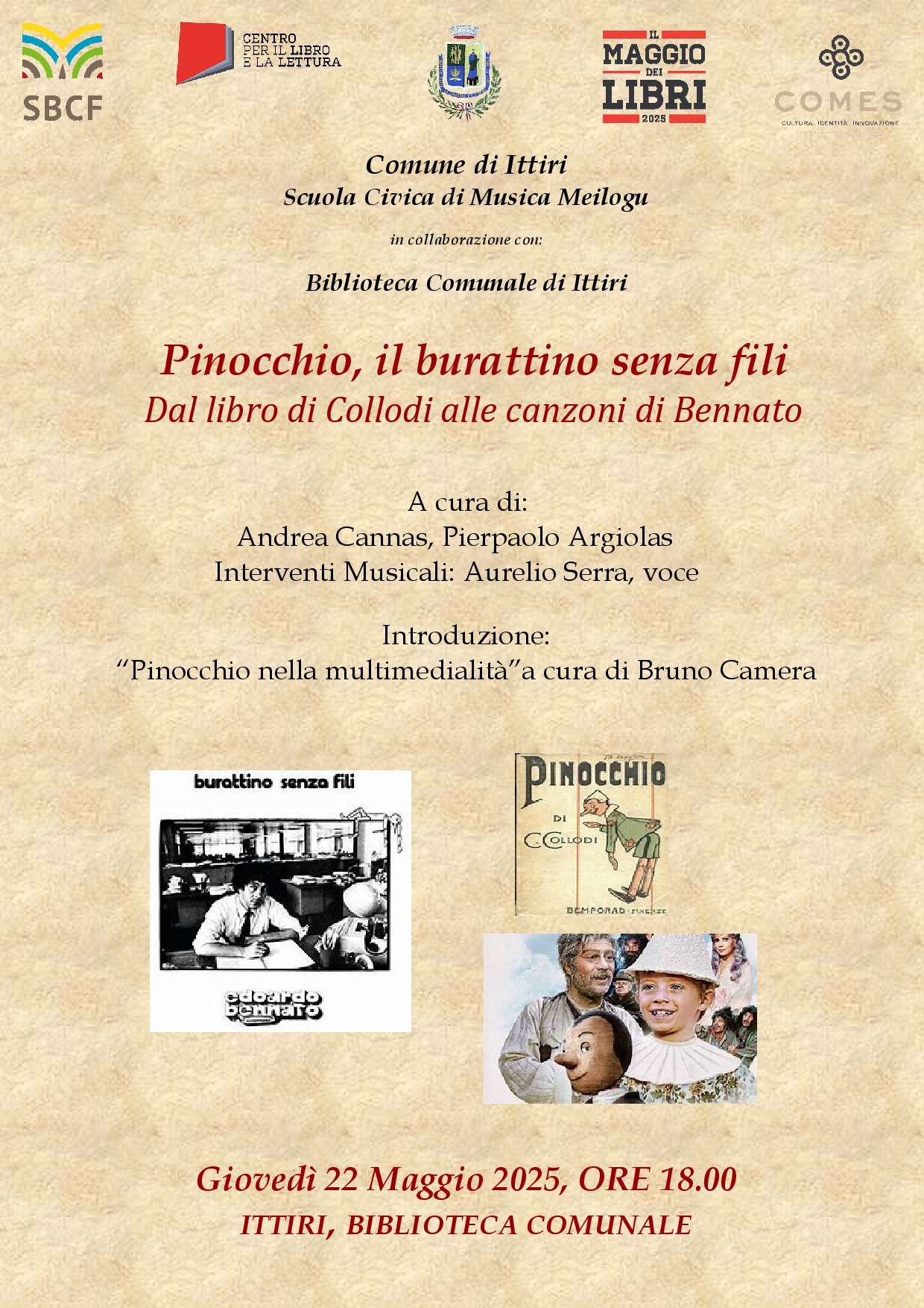 Serata organizzata in collaborazione con la scuola civica di musica. Interverranno dei relatori e attori per parlare di Pinocchio dal libro di Collodi ai vari adattamenti cinematografici. Intermezzi musicali dei brani di Bennato del disco "Burattino senza fili".