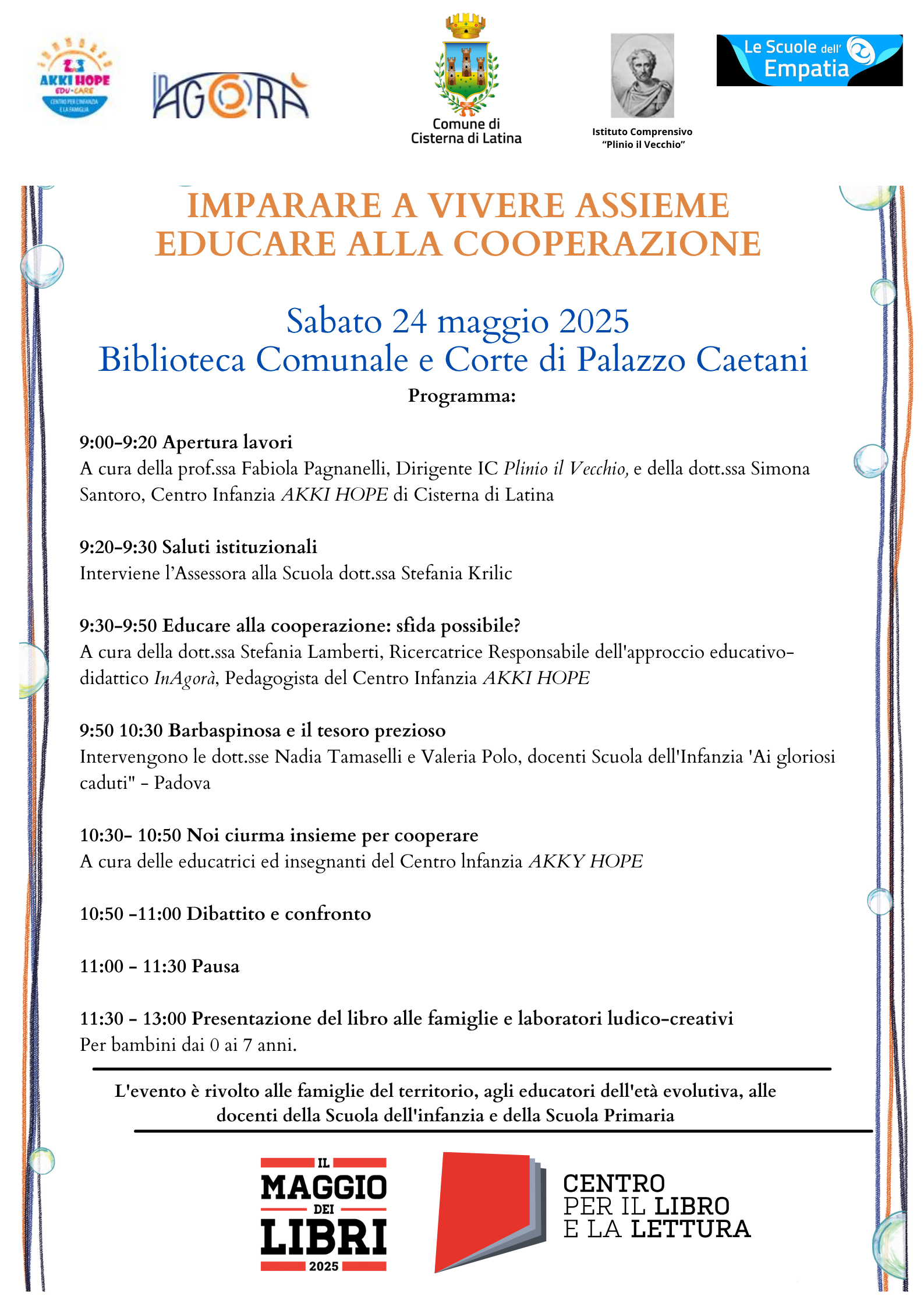 L’Istituto Comprensivo Plinio il Vecchio, in sinergia con il Centro per l'infanzia Akki Hope, partecipa al Maggio dei Libri con un seminario per genitori, educatori e insegnanti della scuola dell’infanzia e della scuola primaria, finalizzato a condividere come si possa imparare a vivere assieme sperimentando il valore della cooperazione.