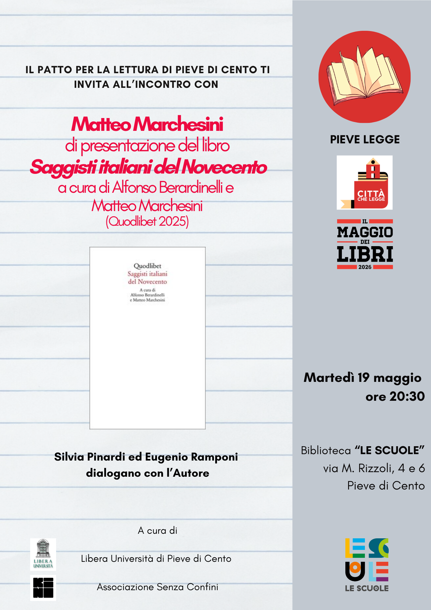 A dialogare con l'autore di saranno Silvia Pinardi, presidente di Libera Università, che da anni accoglie con grande successo ed interesse di pubblico i corsi di letteratura di Marchesini, ed Eugenio Ramponi dell'Associazione Senza Confini.