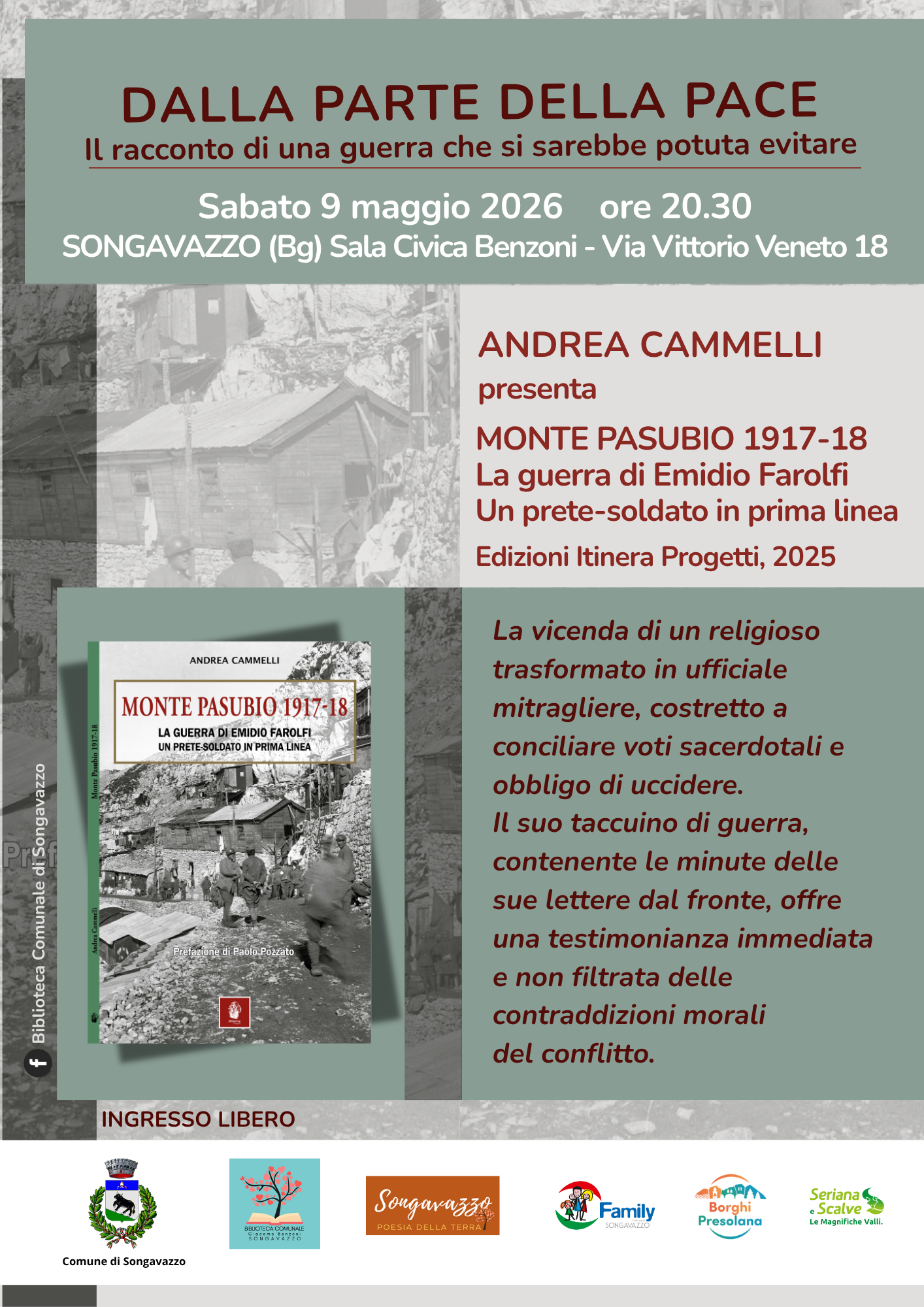 Dalla parte della pace, il racconto di una guerra che si sarebbe potuta evitare è l'occasione quantomai attuale per riflettere sull'importanza della diplomazia e del dialogo. La presentazione del libro di Andrea Cammelli "Monte Pasubio 1917/18. la guerra di Emidio Farolfi, un prete-soldato in prima linea" (Edizioni Itinera Progetti, 2025) è il racconto nato dal ritrovamento di un taccuino di guerra contenente le minute delle lettere dal fronte. Una testimonianza diretta delle contraddizioni morali del conflitto, di tutti i conflitti.