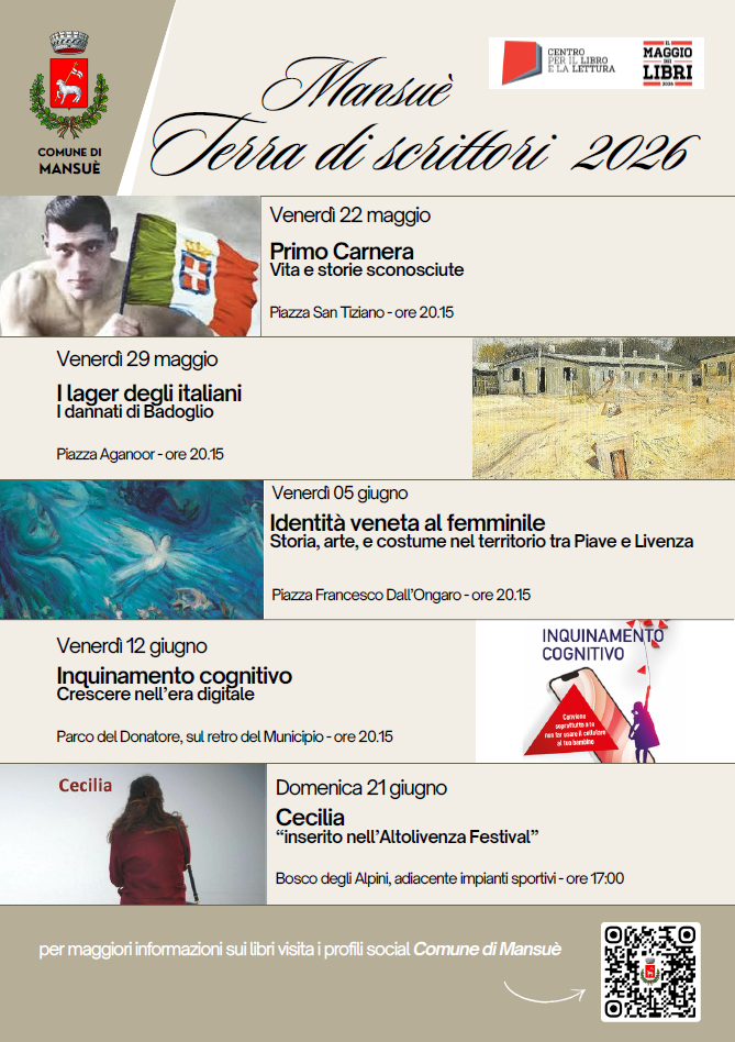 Il Comune di Mansuè presenta la prima edizione della rassegna culturale "Mansuè - Terra di scrittori 2026", un ciclo di incontri dedicati alla promozione della lettura, alla valorizzazione degli autori del territorio e alla scoperta dei luoghi del nostro paese.