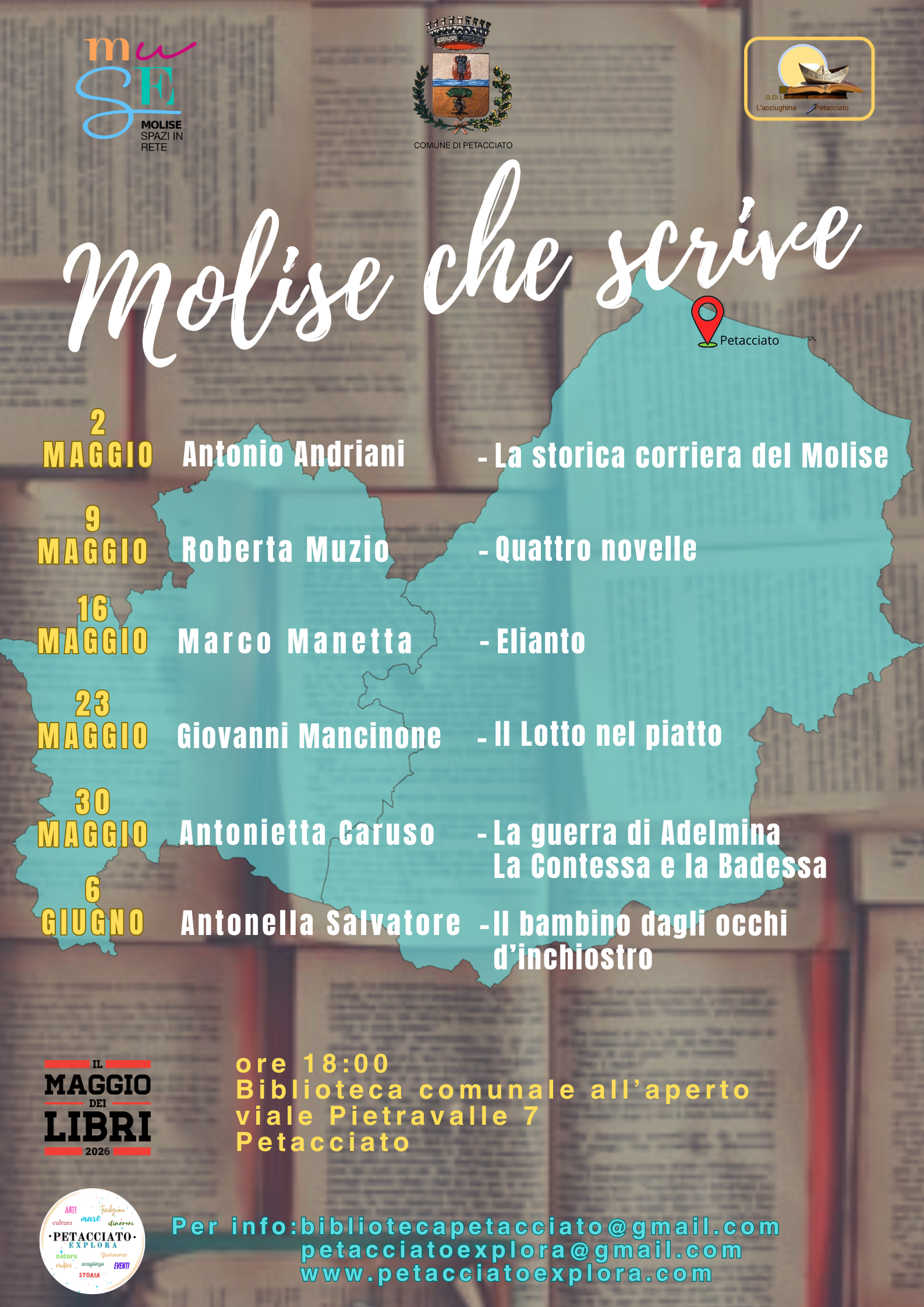 Il progetto "Molise che scrive", nasce per rivalutare una sezione trascurata della nostra biblioteca, quella dedicata ai romanzi scritti da molisani. Tantissimi sono gli autori molisani che scrivono e che, nel loro dialogare con il pubblico, possono essere di esempio e di ispirazione per futuri scrittori. Nel progetto sono stati scelti scrittori che affrontano diverse tematiche e linguaggi, per sottolineare quanto il Molise può offrire dal punto di vista letterario e quanto sia ricco di cultura. Ognuno di loro racconterà al pubblico mondi diversi, ambientati nel nostalgico passato de "La storica corriera del Molise" o nel distopico futuro di "Elianto" o ancora mondi di guerra descritti dagli occhi smarriti di una donna ne "La guerra di Adelmina" o da quelli disperati dei bambini ne "Il bambino dagli occhi d'inchiostro". Viaggeremo poi nell'animo umano con "Quattro novelle" e con "Il Lotto nel piatto" parleremo di ricette del territorio molisano, ascoltando il racconto diretto di massaie e ristoratori che traduco in cibo storie di vita. Anche quest'anno porteremo tante storie in Biblioteca perché crediamo fermamente che in un momento così difficile per il nostro piccolo paese, la cultura sia linfa e speranza.