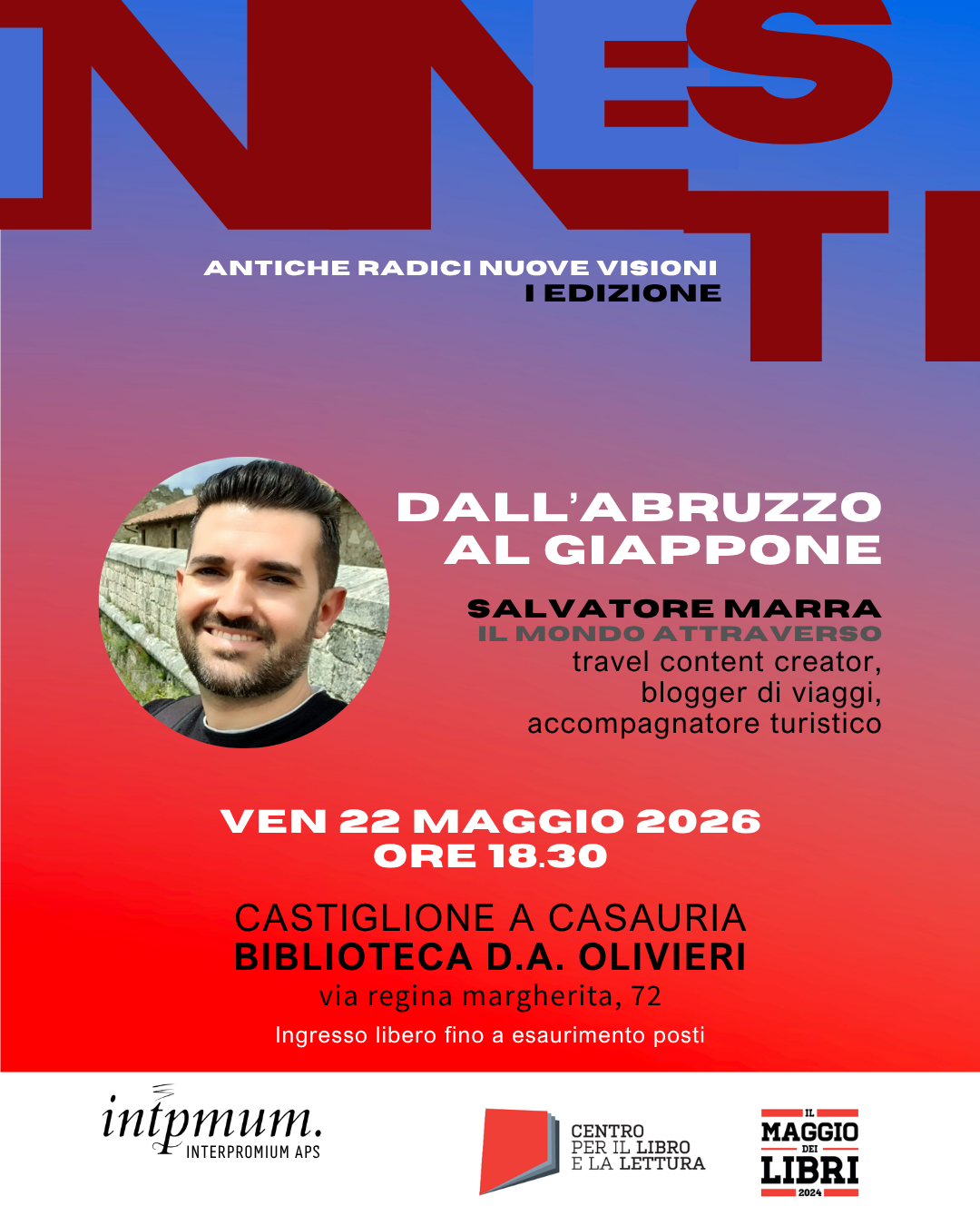 L'incontro rientra nella rassegna "Innesti - antiche radici, nuove visioni" organizzata da Interpromium APS e si terrà presso la Biblioteca D. A. Olivieri, in via Regina Margherita, 72, a Castiglione a Casauria (PE).