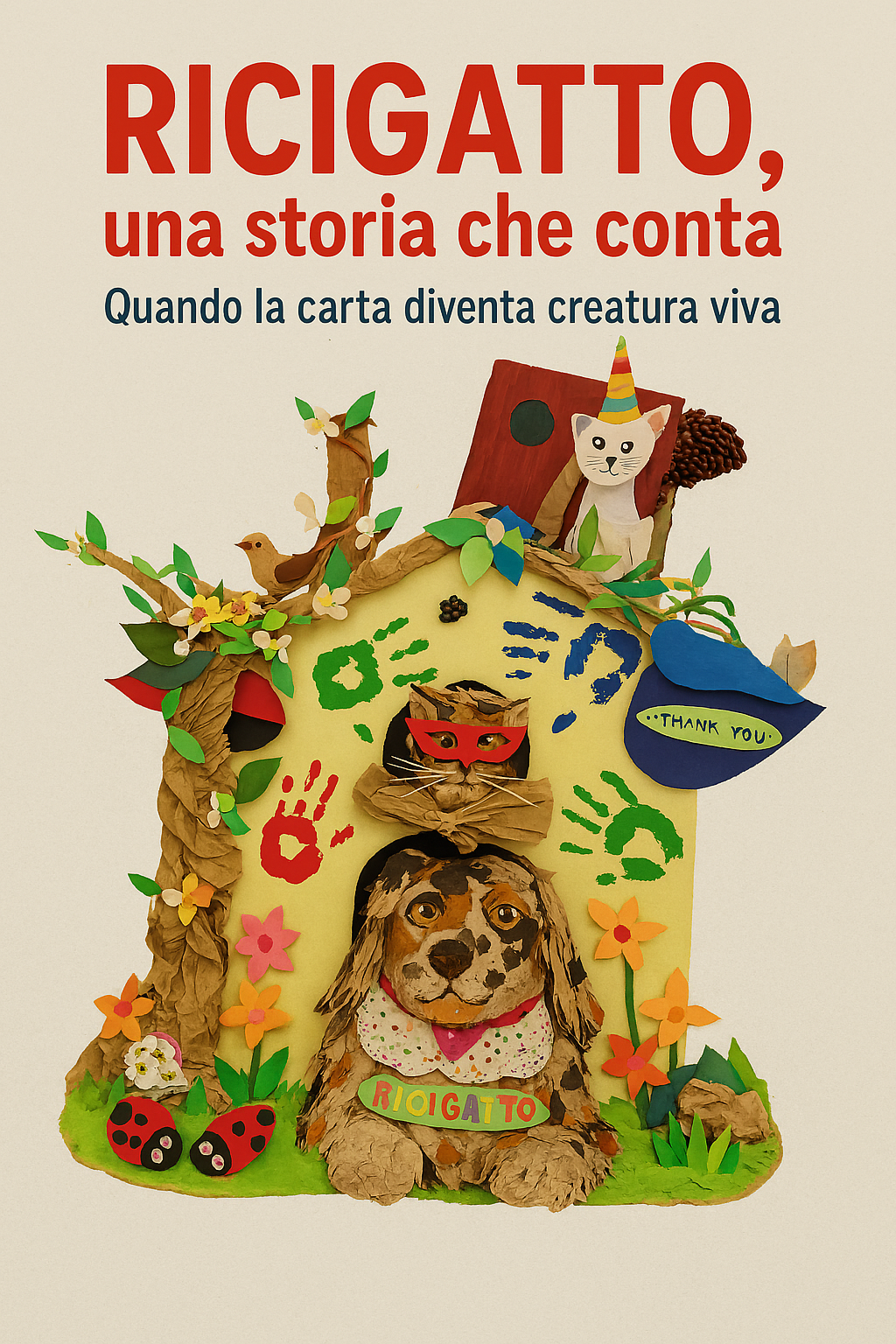 Gli alunni hanno poi dato forma a racconti fantastici con personaggi originali, confluiti in un’unica narrazione collettiva, Ricigatto, una storia che conta, in cui la carta stessa diventa voce narrante. Parallelamente alla scrittura, sperimentando tecniche di manipolazione della carta, découpage, cartapesta, disegno e colorazione, i bambini hanno trasformato materiali cartacei di scarto in personaggi tridimensionali, rendendo visibile e concreta la storia narrata.