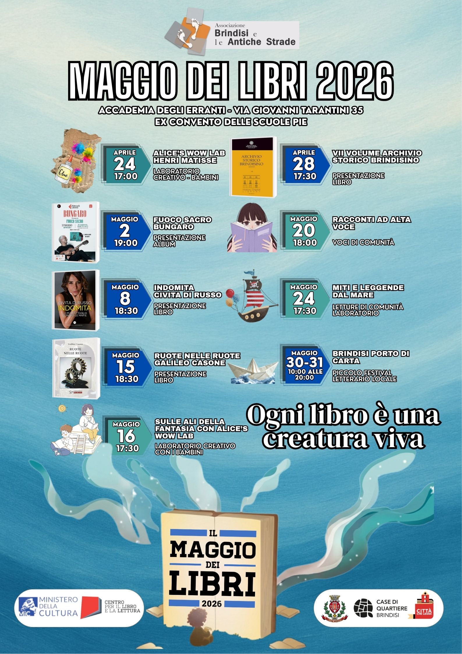 L'iniziativa giunge quest'anno a un importante traguardo: per la sesta volta consecutiva, l’A.p.s. Brindisi e le Antiche Strade - Casa di Quartiere Accademia degli Erranti, propone alla cittadinanza all'interno di "Pagine Erranti" un ricco cartellone, consolidando un appuntamento ormai divenuto un punto di riferimento per il panorama culturale locale. Per questa edizione, il progetto si presenta con il suggestivo sottotitolo "Ogni libro è una creatura viva".