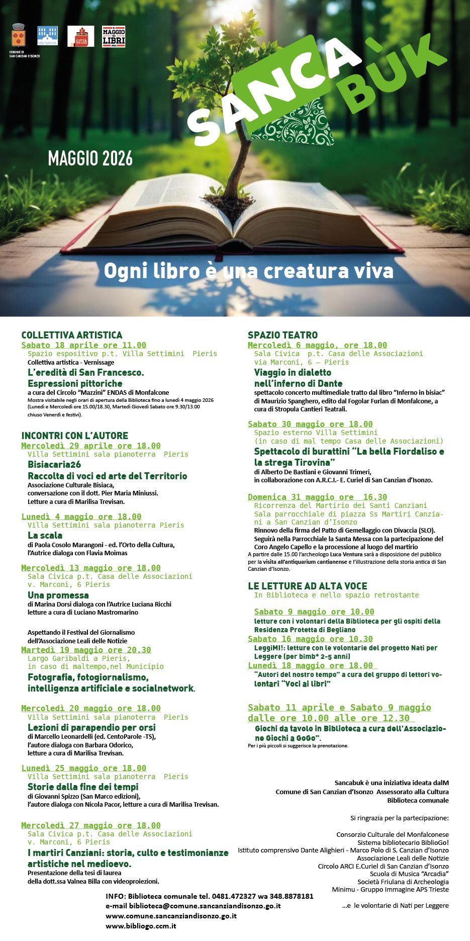Rassegna della biblioteca che prevede diverse tipologie di interventi volti a favorire la conoscenza delle arti e del territorio, la promozione della lettura, della socialità e della cittadinanza attiva. In programma negli spazi della biblioteca comunale una collettiva artistica con opere di autori del territorio, incontri con l'autore, spazio teatro per adulti e bambini, letture ad alta voce con lettori volontari e giochi da tavolo in biblioteca.
