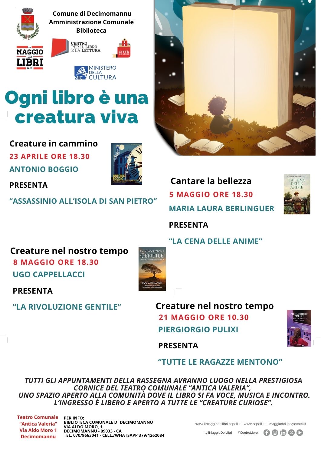 Quest’anno la Biblioteca di Decimomannu trasforma le pagine in battiti. In occasione del Maggio dei Libri 2026, il Teatro Comunale "Antica Valeria" ospita un ciclo di incontri dove il libro diventa "creatura": compagno di viaggio, specchio dell'anima e voce del presente.